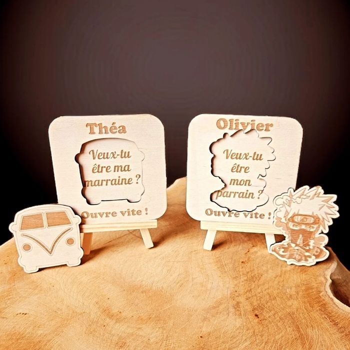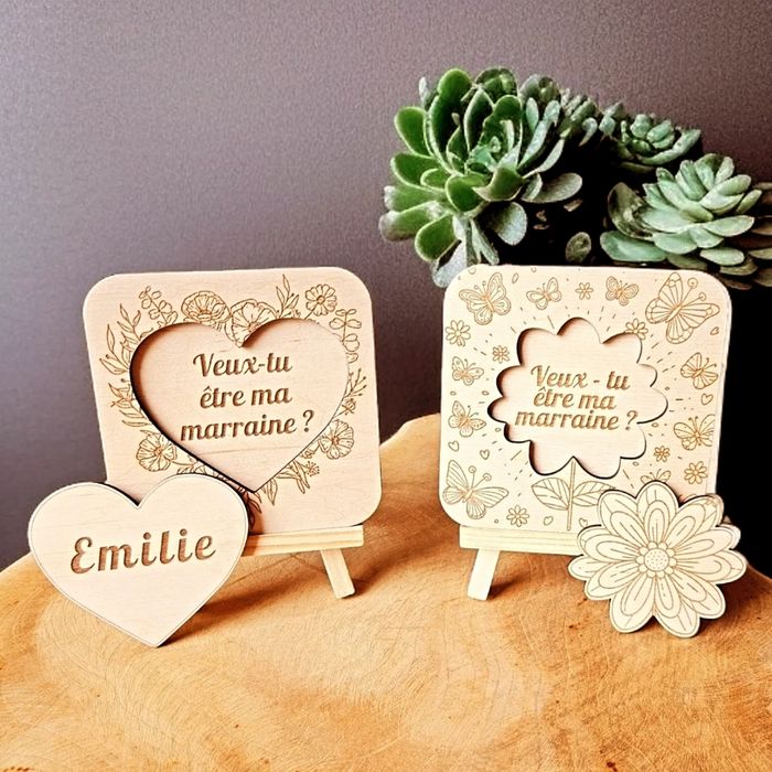 Vous cherchez une façon unique et pleine d’émotion de demander à quelqu’un de devenir marraine, parrain ou annoncer un heureux événement ? Je propose de magnifiques carrés en bois gravés, parfaits pour ce moment spécial. Texte personnalisable : prénom, message, date, petit cœur, etc. Format : 9,7x9,7 cm (ou à préciser) Bois naturel, gravure fine et soignée Un souvenir à garder précieusement, parfait pour une annonce surprise et touchante ! Prix unitaire : 6,50 (prix dégressif) État : Neuf, fait main Lieu : sud de la France N’hésitez pas à me contacter pour toute personnalisation ou question !