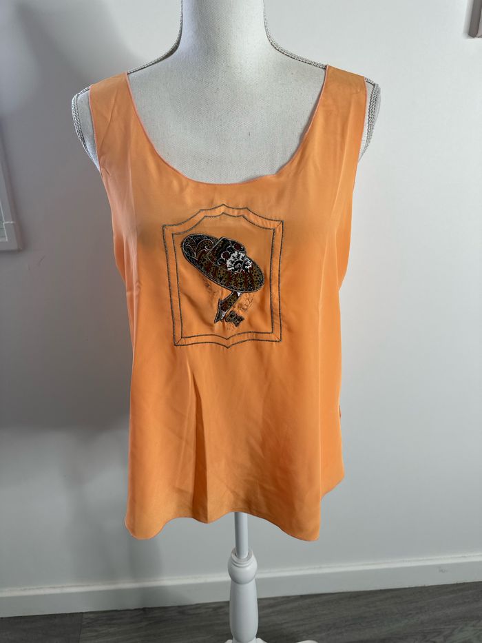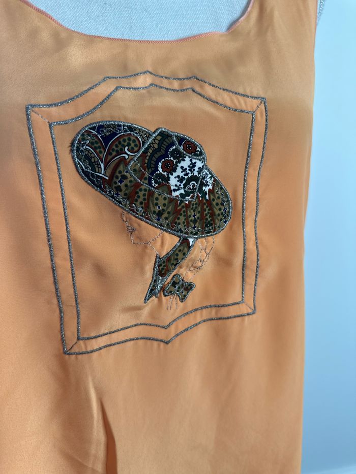 Débardeur - Excellent état - Taille 38 équivalent M - Orange et argenté - Broderie femme à chapeau - Sans manche - Légèrement fendu sur le côté - Pas d’étiquette de taille ni de matière - Tissus fluide et aérien - Vintage, années 80’ Dimensions: - 50cm niveau aisselles - 60cm de long