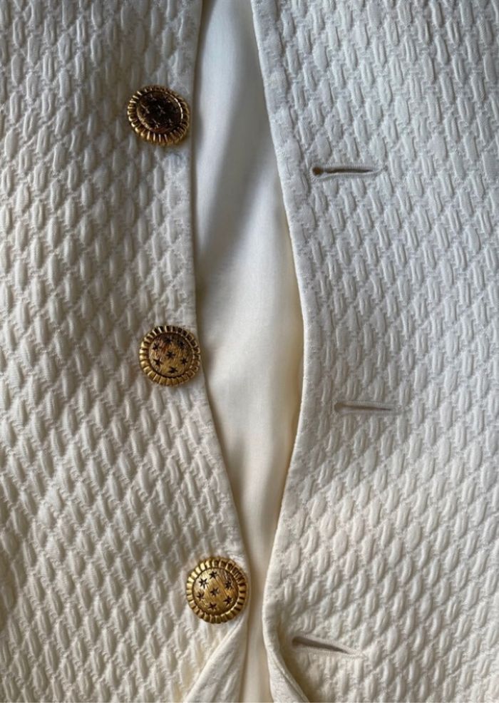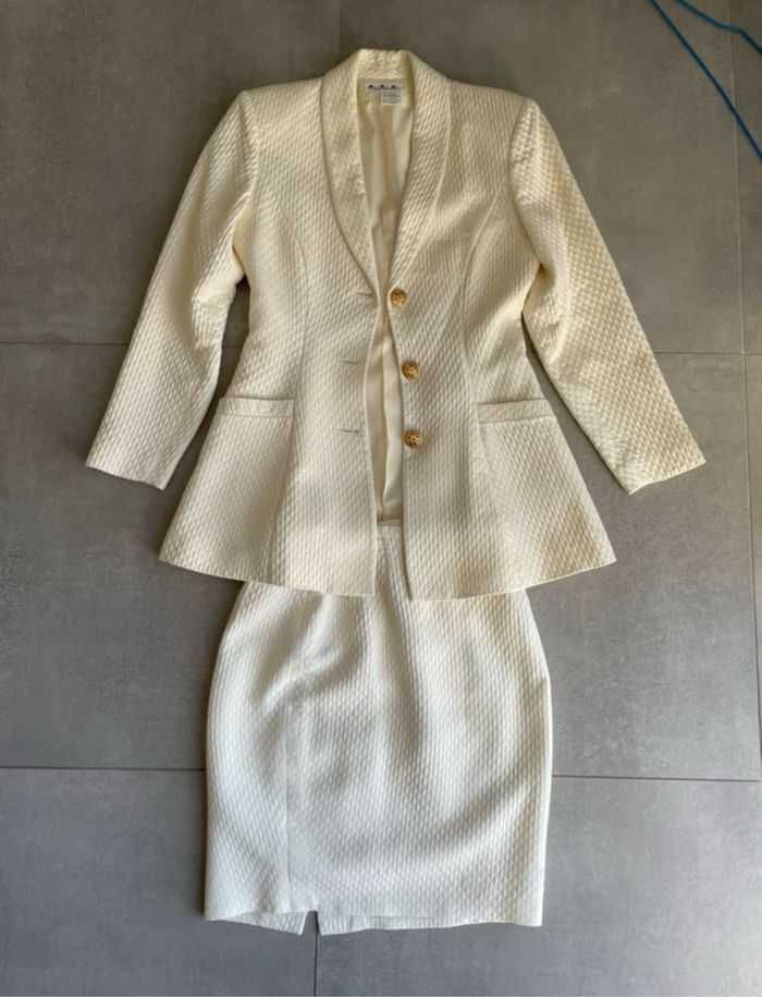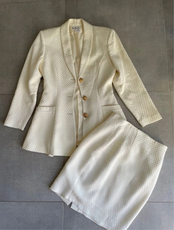 Cet ensemble est en très bon état, n’a été porté qu’une seule fois. L’ensemble est composé d’un jolie tissus couleur crème, de boutons effet or et d’un ruban au dos du blazer. Jupe et blazer sont en taille 40 Prix négociable !