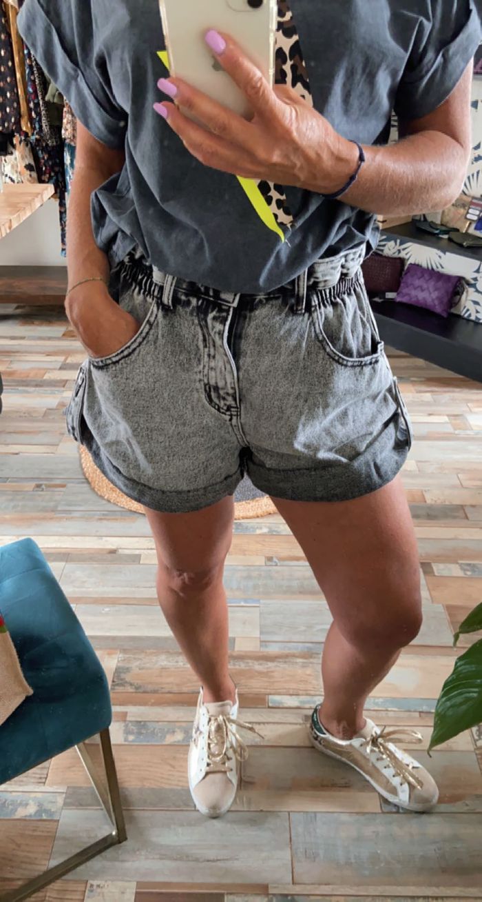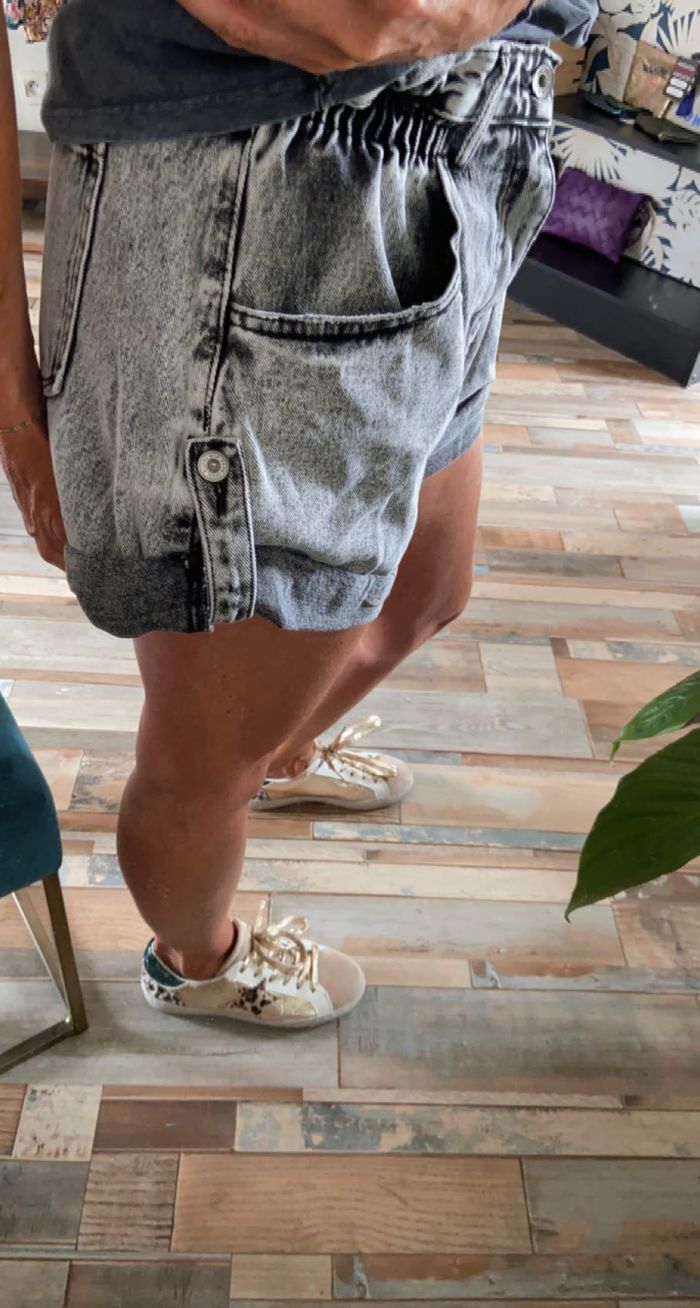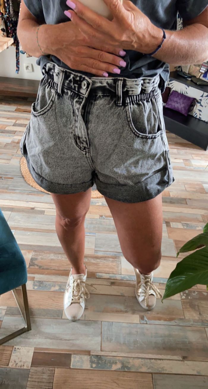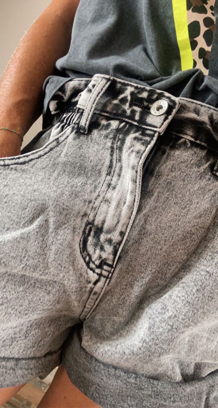 Je vends short taille haute coupe légèrement évasée, revers en bas des jambes Taille très grand c’est un 42 mais peut largement convenir à un 44 . Il est en coton