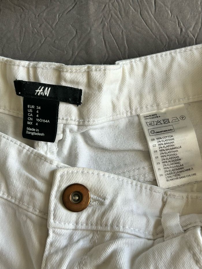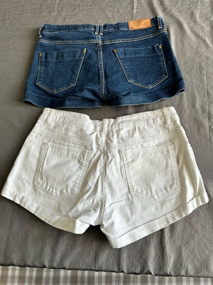 Lot de 2 shorts courts taille 34 XS. Forme jeans avec poches classiques. -1 blanc avec petits revers de la marque « H&M ». -1 bleue jeans très foncés également de la marque « H&M ». En très bon état.