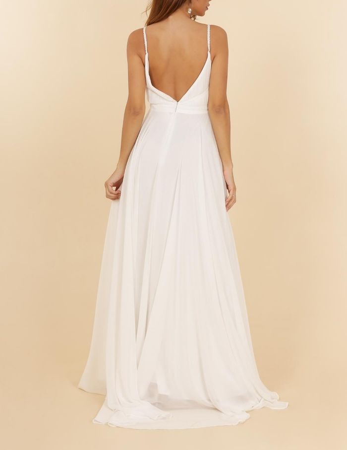 robe de cérémonie longue coupe empire . taille haute sous la poitrine.  effet plissé au niveau de la poitrine.et perlées. bretelles fine réglables perlées  dos nu. Bas évasé en mousseline avec petite traîne.  coque en mousse au niveau de la poitrine pour un meilleur maintien  couleur blanc Taille 38 Neuf