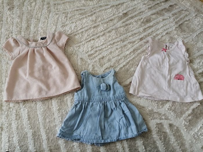 Vends 3 robes de taille 1 mois de la marque kiabi et H&M. Ces robes sont en bon état, ni tachées ni trouées. La robe rose est pailletée de gris. La robe en jean quand à elle est un peu délavée par endroit comme au niveau du col par exemple.