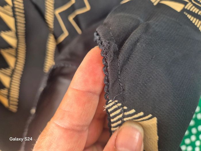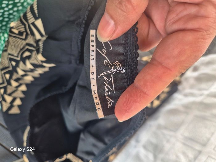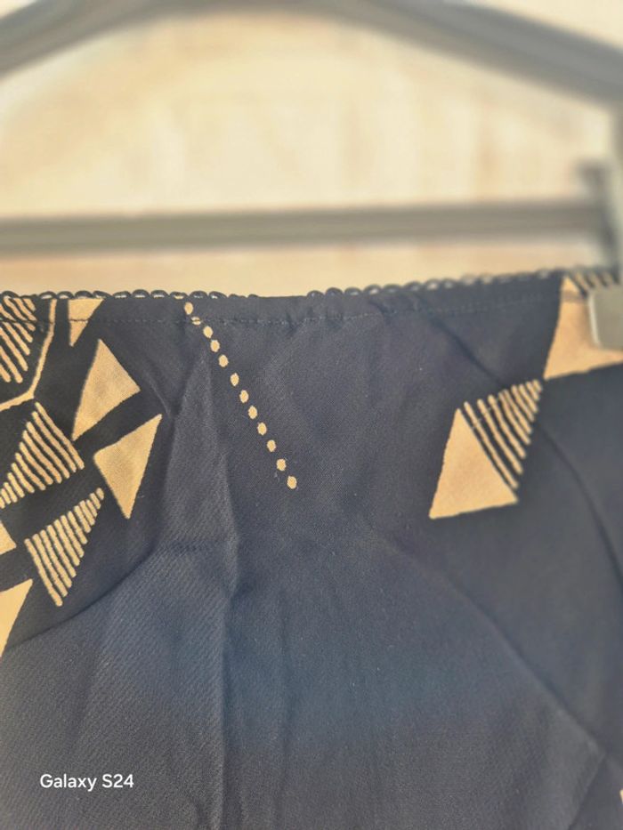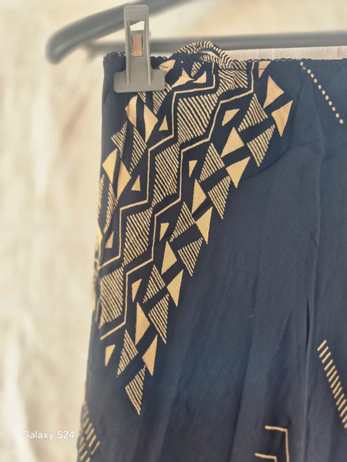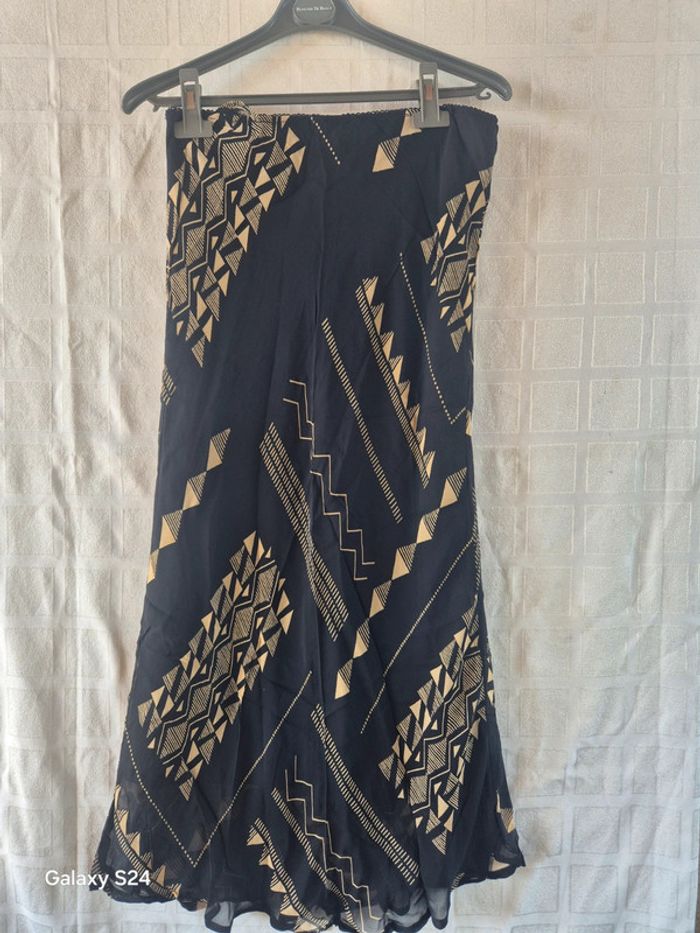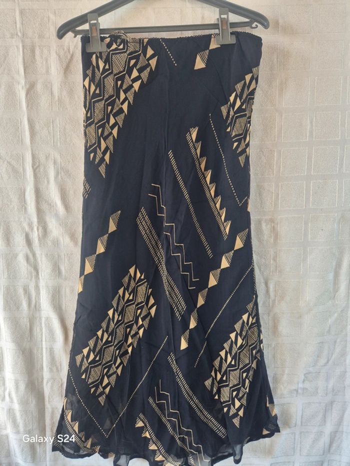 ⬇️mes autres annonces pour femme en taille 40 👉 #cg89femme40 une jupe longue noir avec motif géométrique beige. La taille est élastiqué, la jupe est en voile mais doublé donc non transparente. Elle mesure 90 cm de longueur et 35 cm de largeur (sans tirer l'élastique). Petits défauts sur l'élastique à la taille, mais cela ne se voit quasi pas (voir photo) bon état - taille 40 - marque café théatre #jupelonge #geometrique #voile #taille40