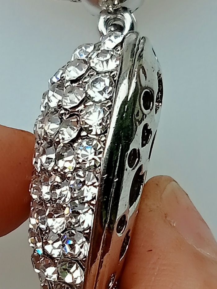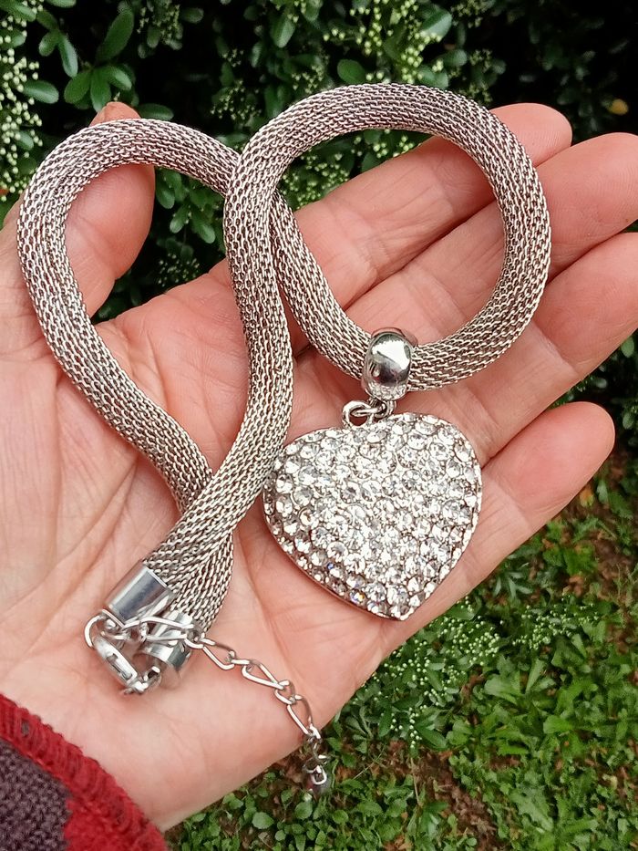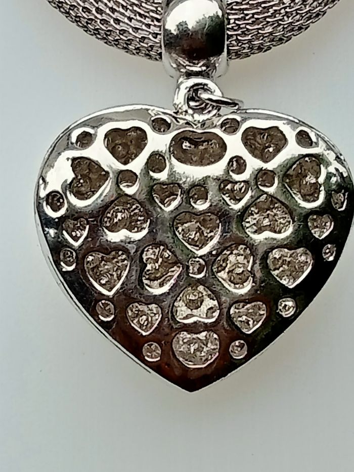 Collier coeur de 3,5 cm x 4 cm, pavés de Zircons sur une face et dentelle de coeur sur l'autre. très belle chaîne en métal rhodié en parfait état présentant un tout petit défaut montré sur dernière photo mais qui ne se voit pas porté. poids 50 g, long 43 g + 7 cm de chaînette.