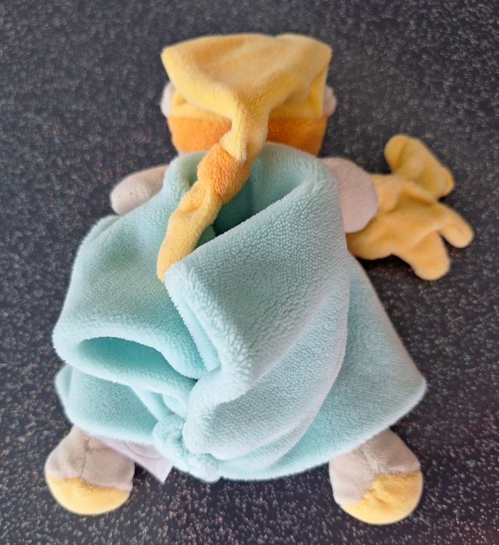 DOUDOU OURS MENTHE DE LA COLLECTION LES ANIMAUX GRAFFITIS - DOUDOU ET COMPAGNIE FORME AMUSANTE EN VELOURS BLEU/VERT,JAUNE, ORANGE ET BEIGE A UNE MAIN, EST ACCROCHE UN PETIT NOUNOURS ETAT PARFAIT !