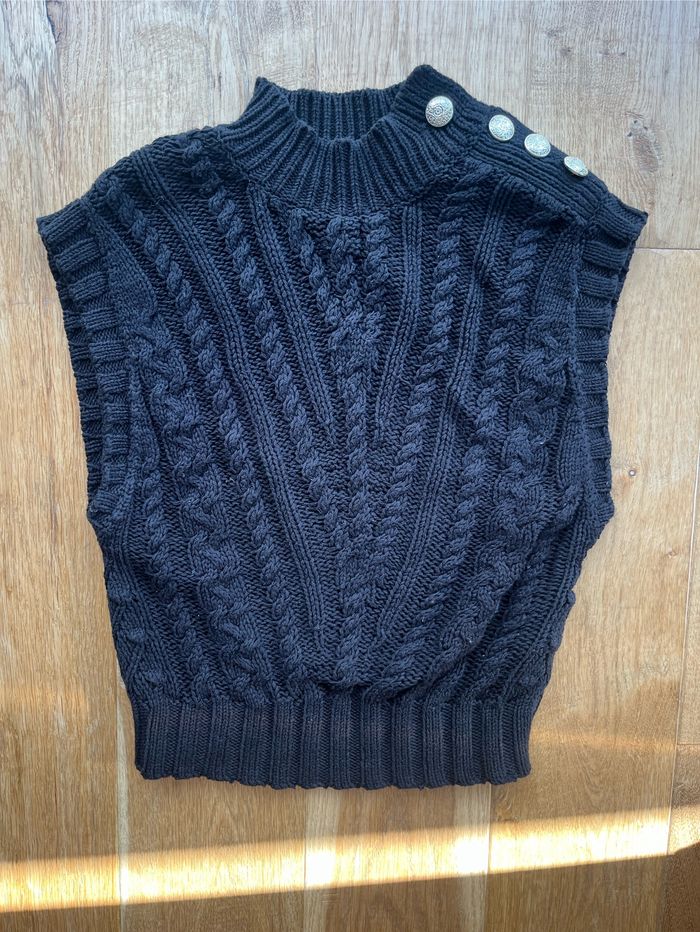 Joli pull sans manche tressé noir à boutons dorés - photo numéro 1