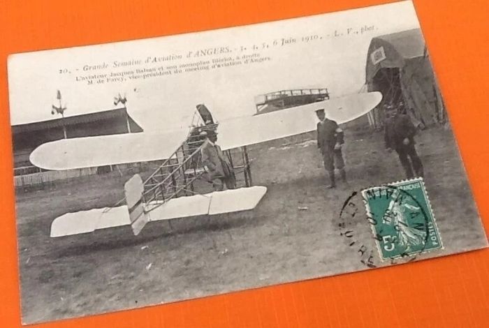 Carte postale ancienne Grande Semaine d´Aviation d' Angers 3,4,5,6 Juin 1910 L' aviateur Jacques Balsan et son monoplan Blériot, à droite, M. de Farey, vice-président du meeting d' aviation d' Angers. N°20