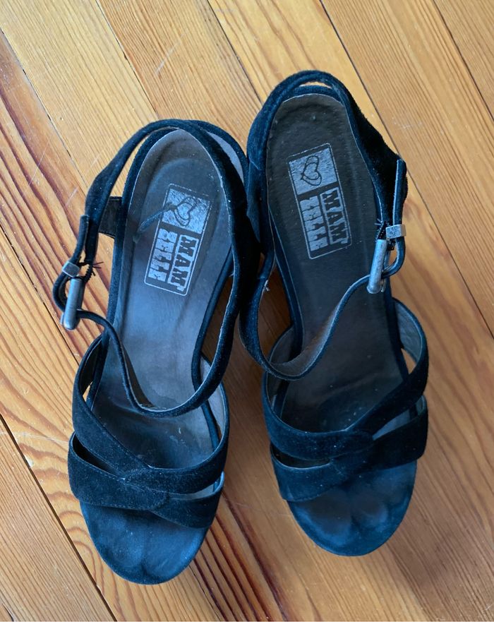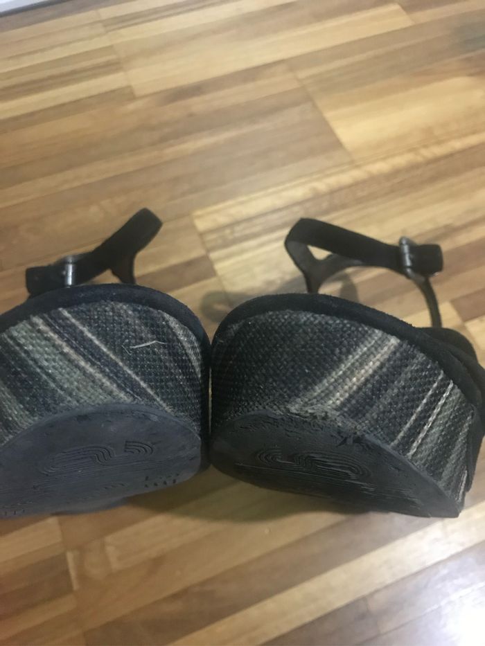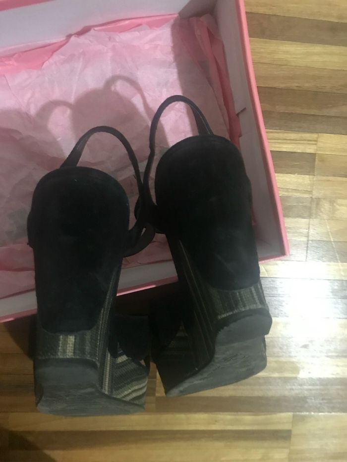 Nu-pieds noir à semelles compensées en 40 Tissu doux comme le velours Hauteur du talon 11 cm Hauteur semelles devant 3 cm Bon état juste semelles un peu frottée devant