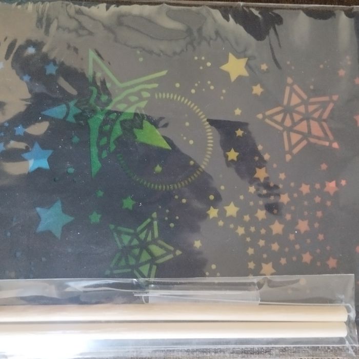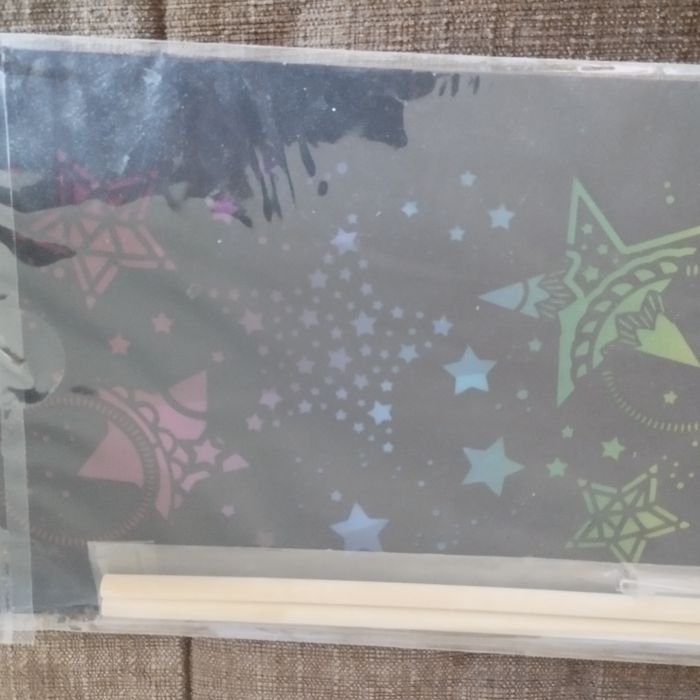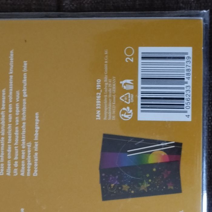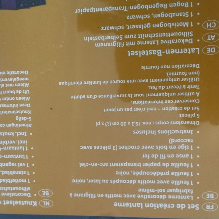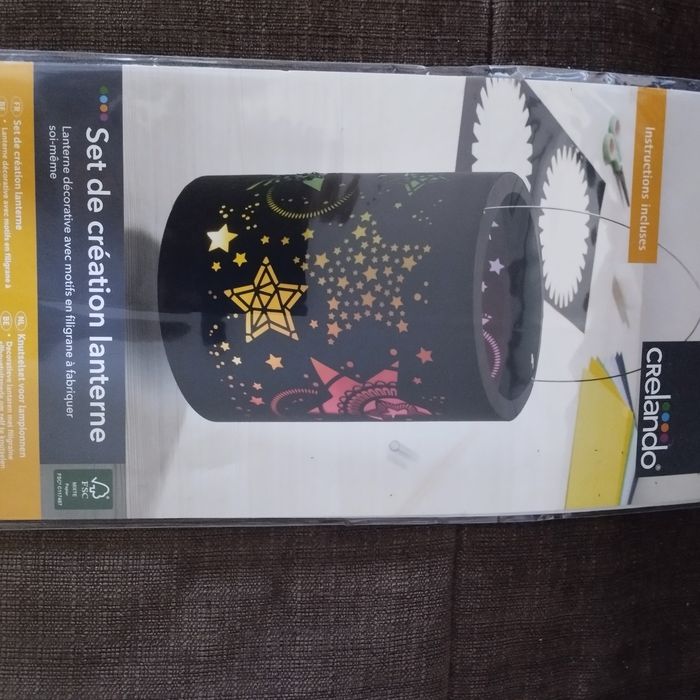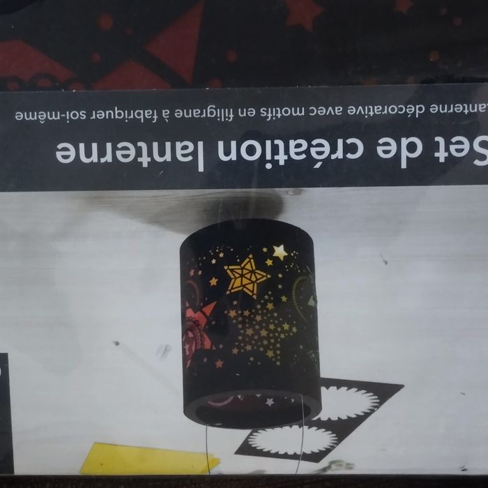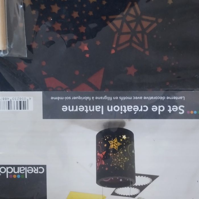 Set de création fabrique une lanterne décorative avec motifs en filigrane, comprenant: 1 feuille noire avec motifs découpés au laser, 1 feuille prédécoupée noire, 1 feuille de papier transparent arc-en-cliel, 1 anse en fil de fer, 2 tiges en bois avec crochet. Dans son emballage d'origine jamais ouvert.