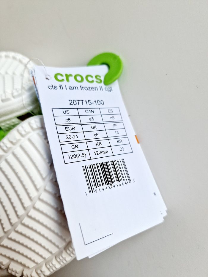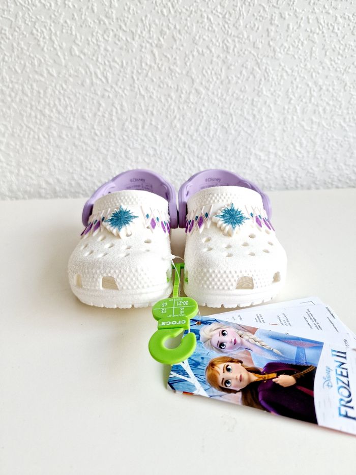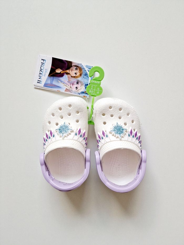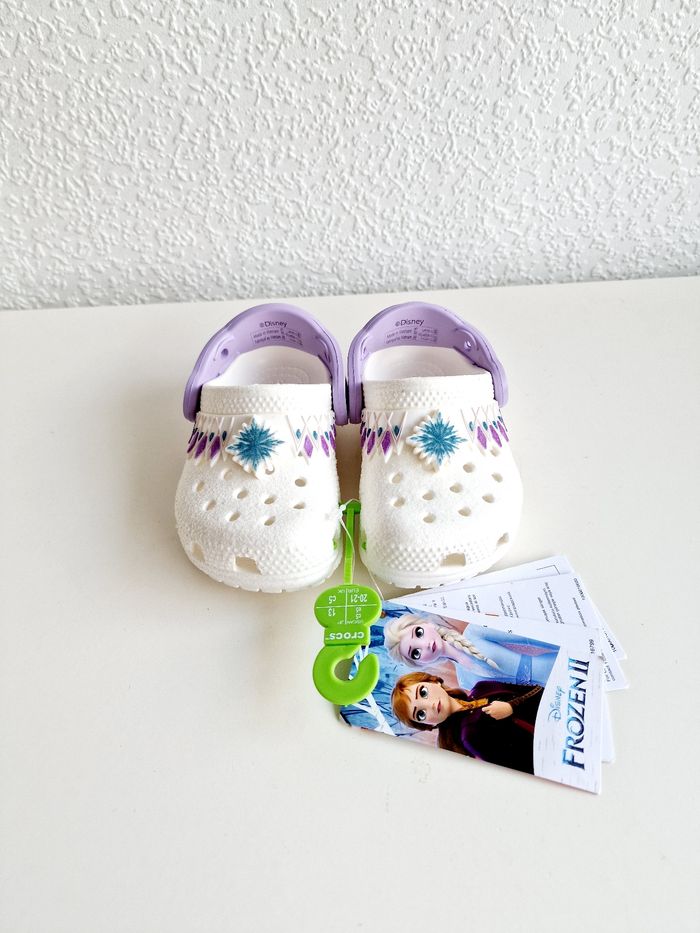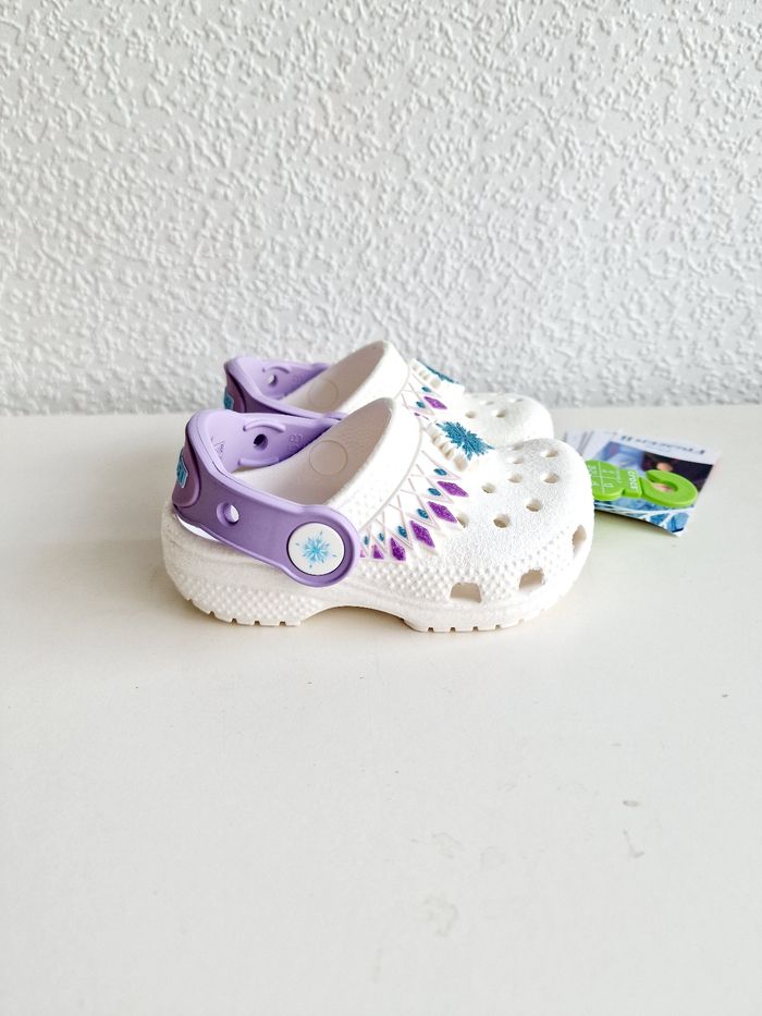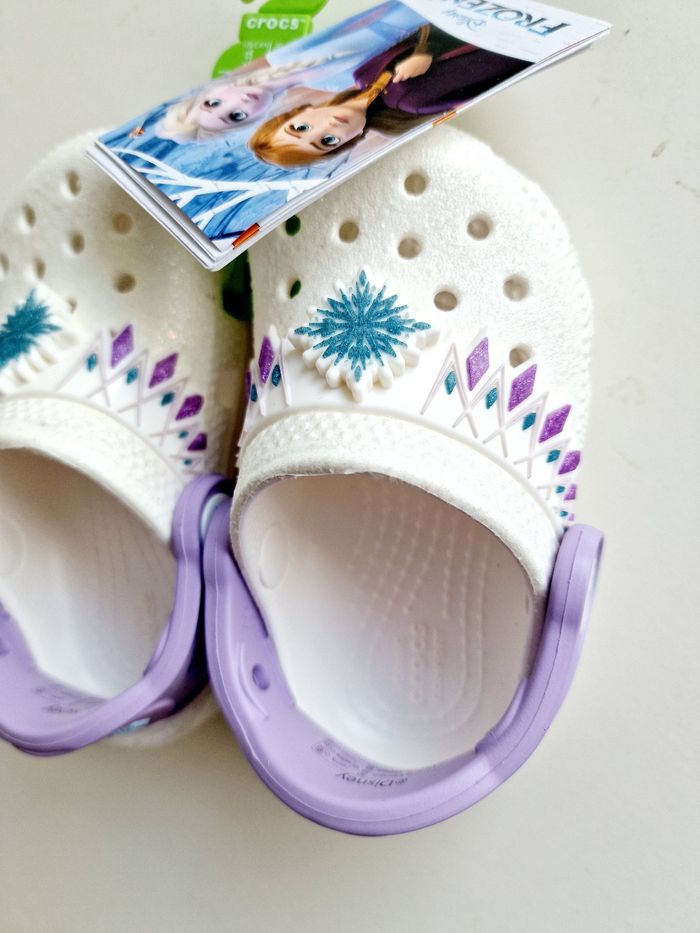 🚨 Prix fixe Sabot / chaussures souples - La Reine des Neiges Marque : CROCS Modèle : Toddler Classic Fun Disney Frozen Couleur : blanc pailleté État : neuf avec étiquette Pointure : C5 = 20/21 Retrait sur place ou envoi.