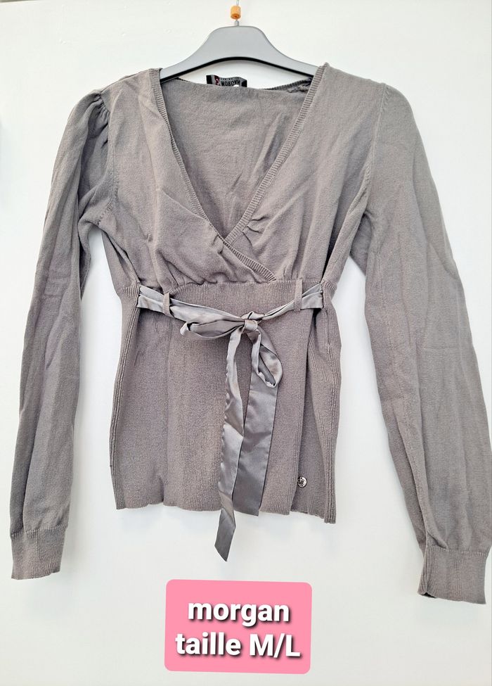 pull en tres bon état à nouer à la taille marque: morgan noté taille L mais convient tres bien à un M 38/40 car près du corps
