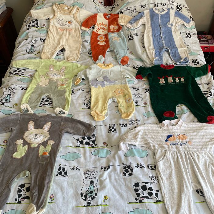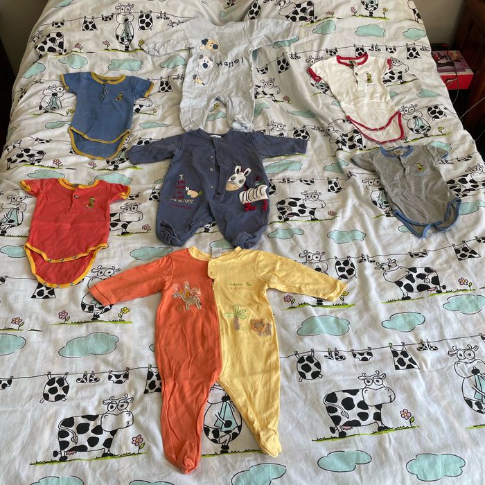 Bonjour lot 14 pièces garçon 8 pyjamas velours (cocoon c&a dpam) 3 pyjamas coton (tex sucre d’orge absorba) 3 bodies manches courtes (dpam) je ne compte pas le bleu qui a une légère décoloration sur le côté je le donne en plus
