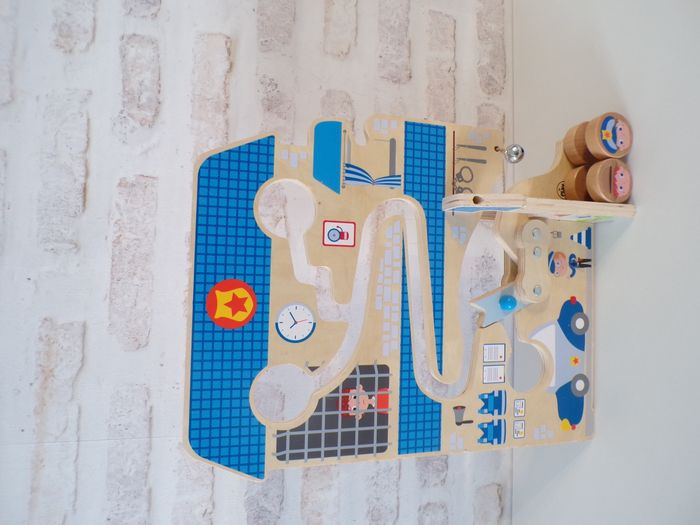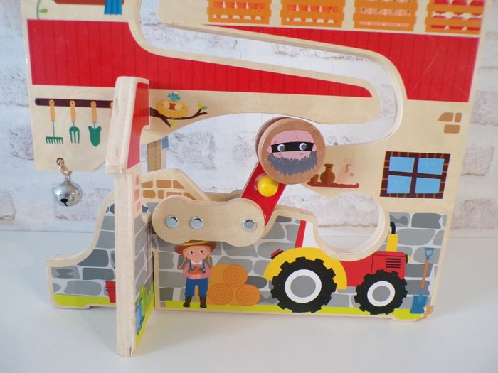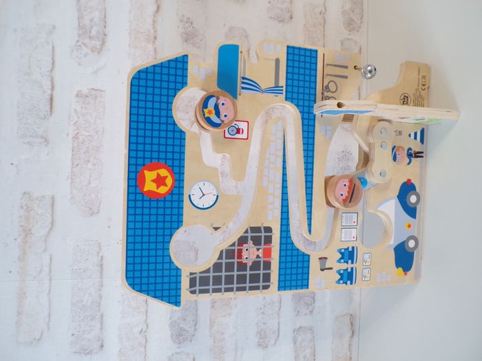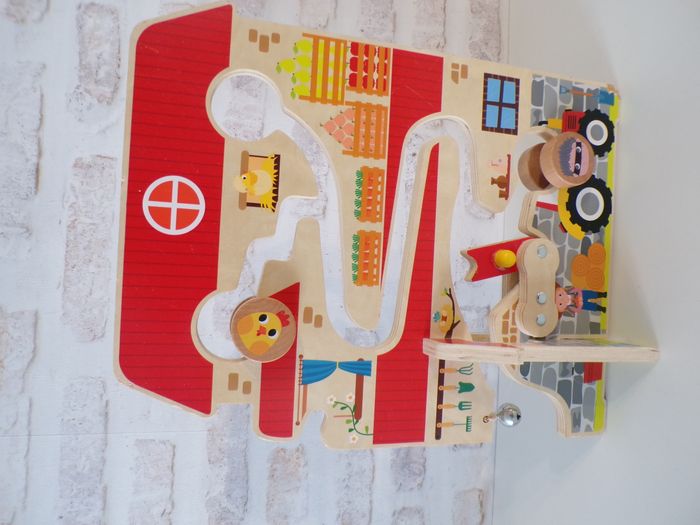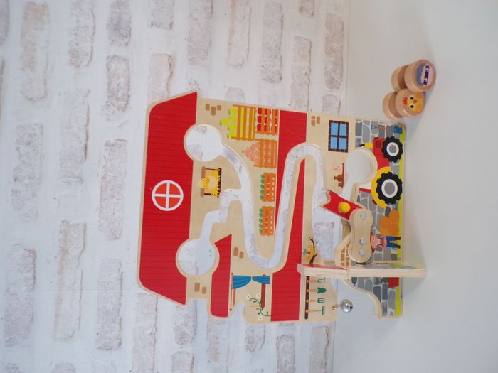 Jeux labyrinthe en bois 1er âge, en bon état, traces d'utilisations. Le jeu est complet et réversible. D'un côté il y a le thème de la ferme et de l'autre le commissariat de police. Différents chemin en soulevant une pièce.
