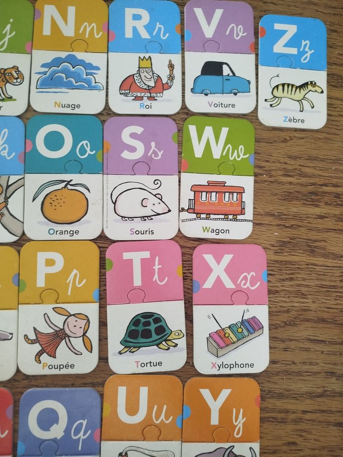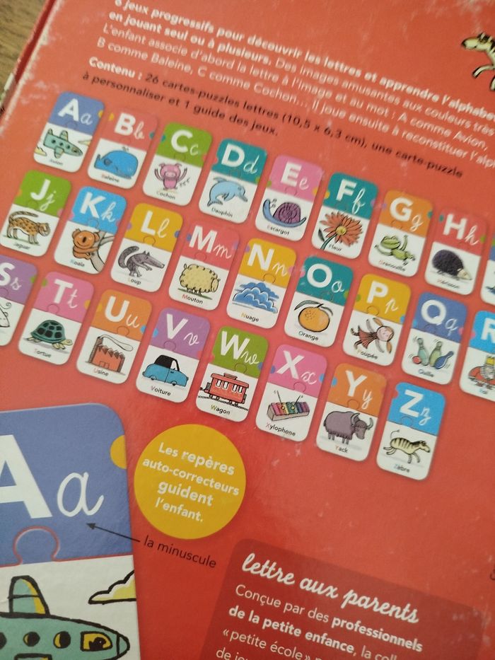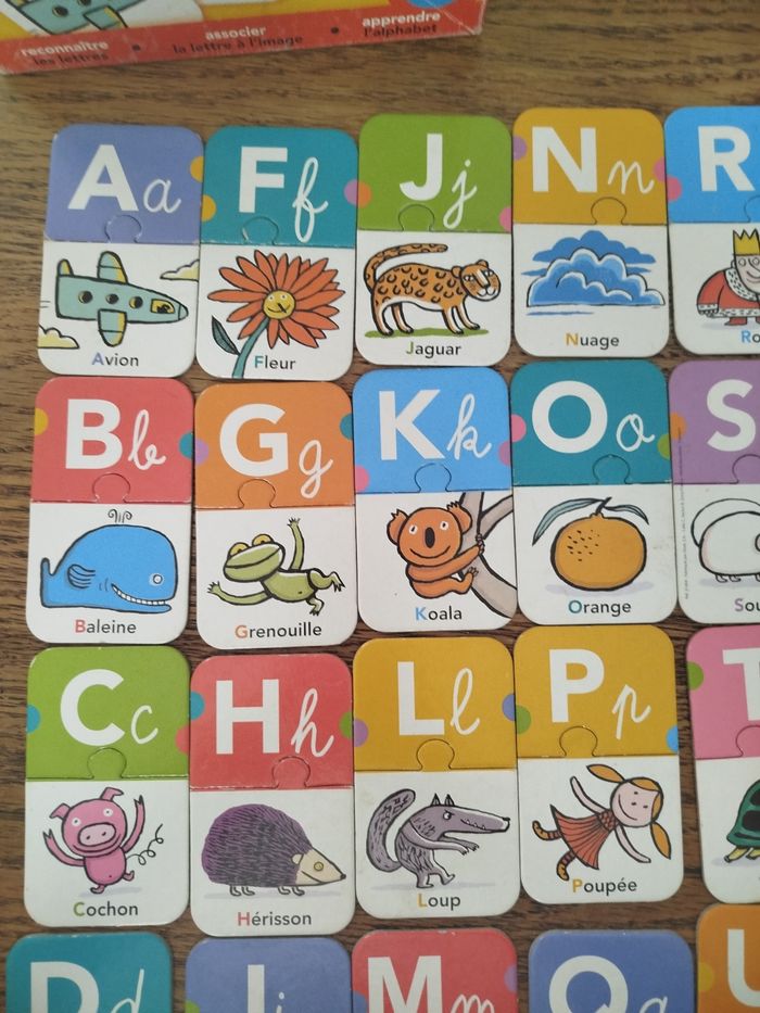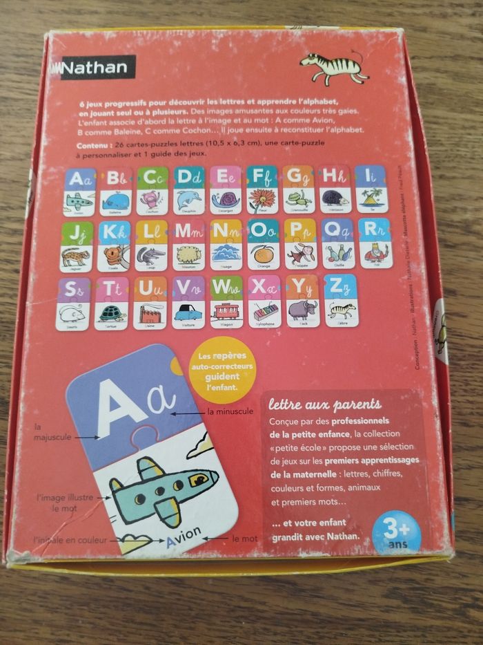 En très bon état, juste boîte légèrement abîmée 6 jeux progressive pour découvrir les lettres et apprendre l'alphabet, en jouant seul ou à plusieurs. Des images amusantes ou couleur très gai. L'enfant associe d'abord la lettre à l'image et aux mots.
