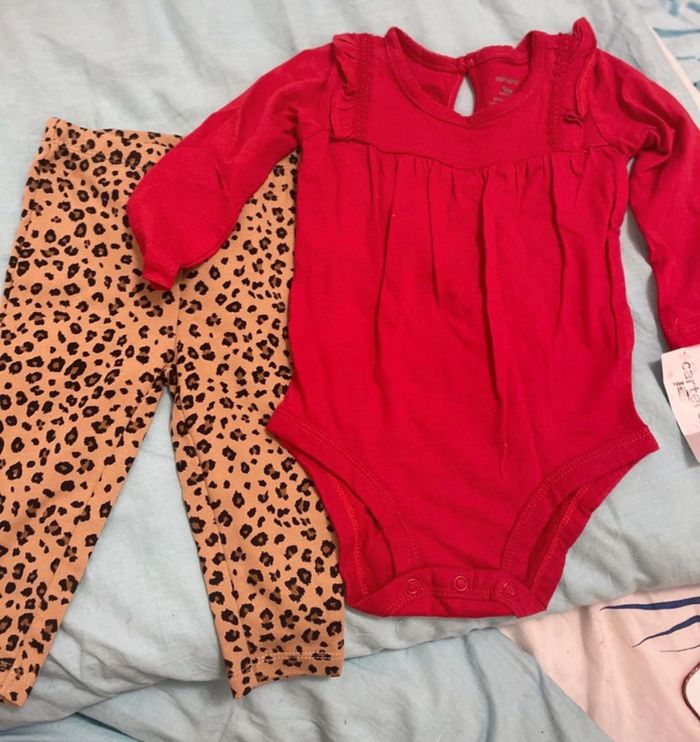 Ensemble de la marque américaine Carter’s. Bodie rouge avec un peu de dentelle et un legging léopard.