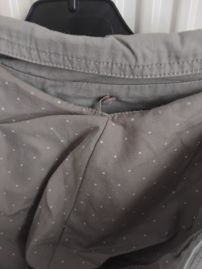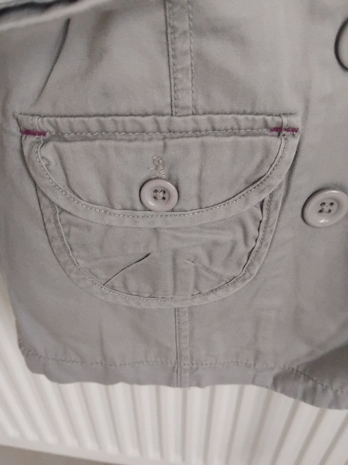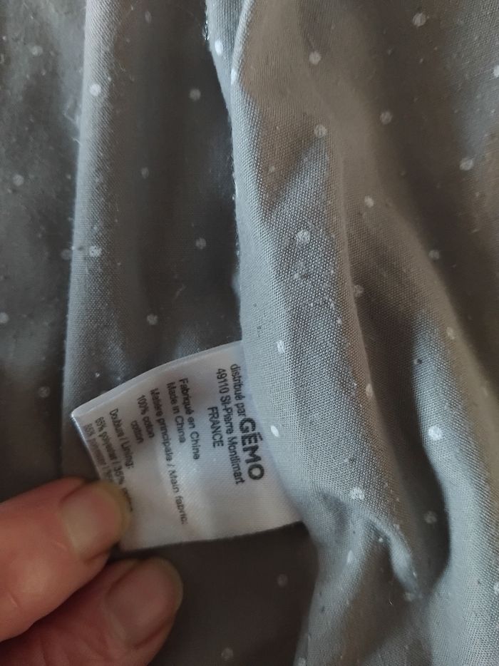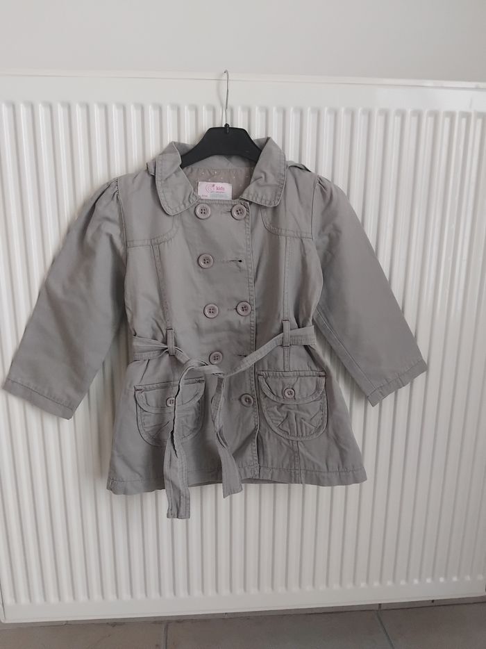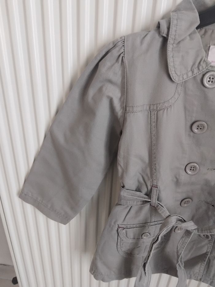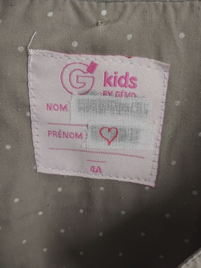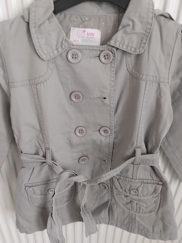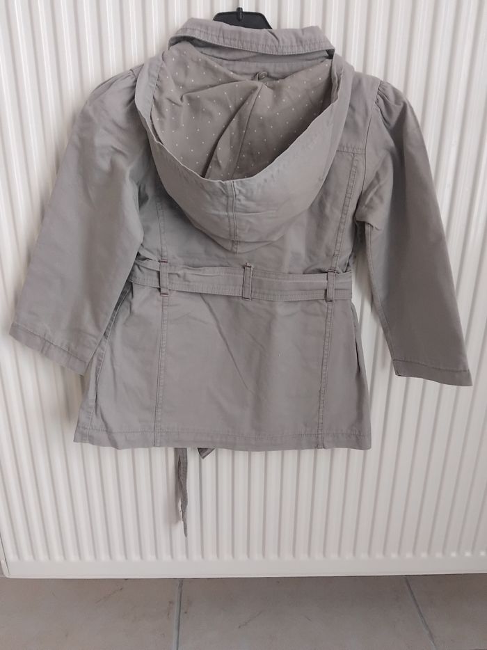 Veste à capuche de couleur grise. Ouverture boutons et ceinture. 2 petites poches. 35% coton, 65% polyester. La capuche peut se retirer boutons. L'élastique tenant les boutons peuvent être légèrement détendu. J ai mis une bande autocollante sur l étiquette prénom pour effacer le prénom de ma fille. Marque Gémo. #fille4ansnade3033 #manteaufillenade3033