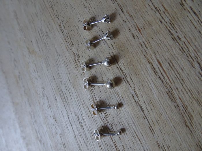 Lot de 3 paires de boucles d'oreilles fantaisies couleur argent, achetées mais au final jamais portées. Fermoirs papillon. Deux paires avec boules de taille différente, une paire avec zirconium strass.