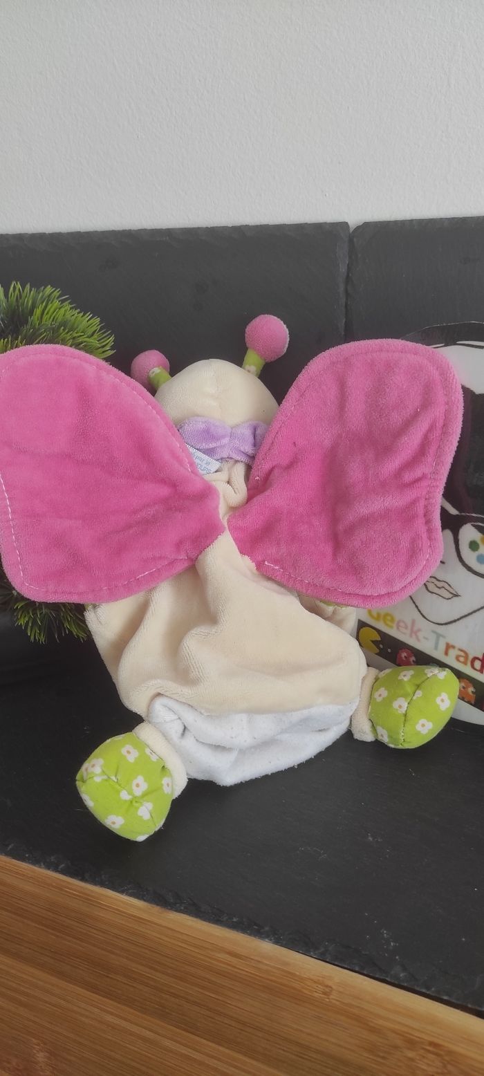 Papillon nounours doudou marionnette beige vert rose aile ancien Fleur Rond - photo numéro 2