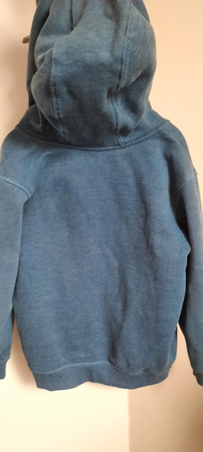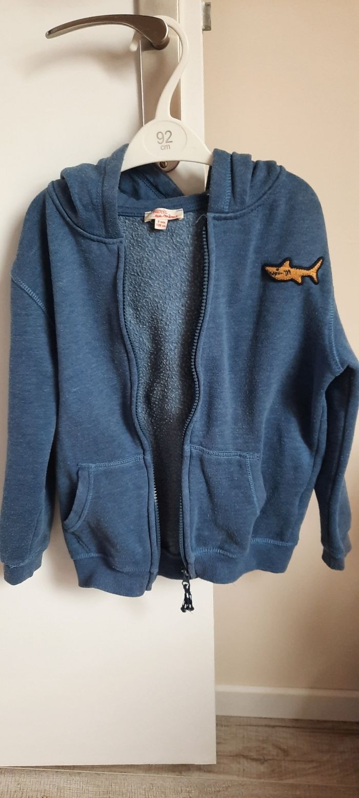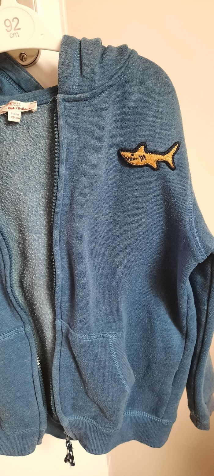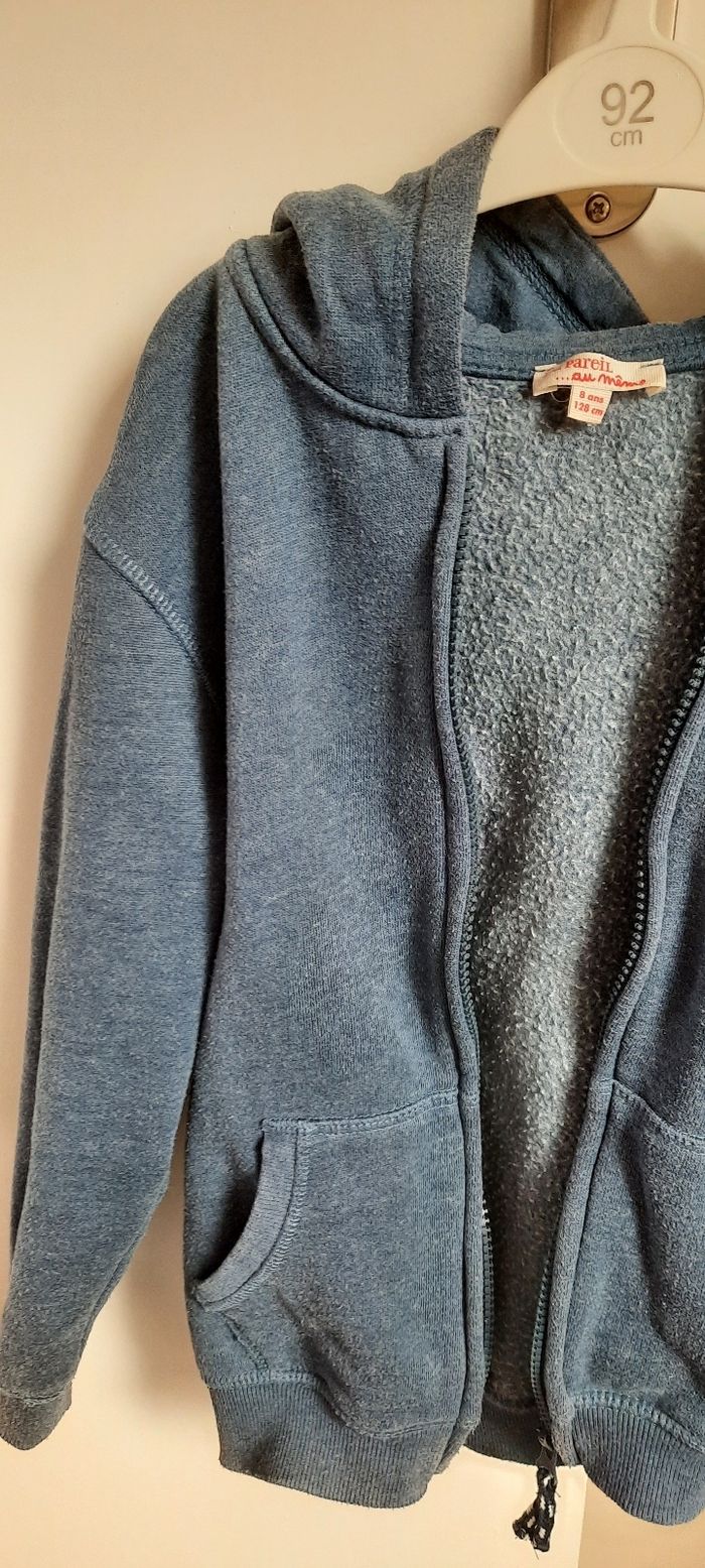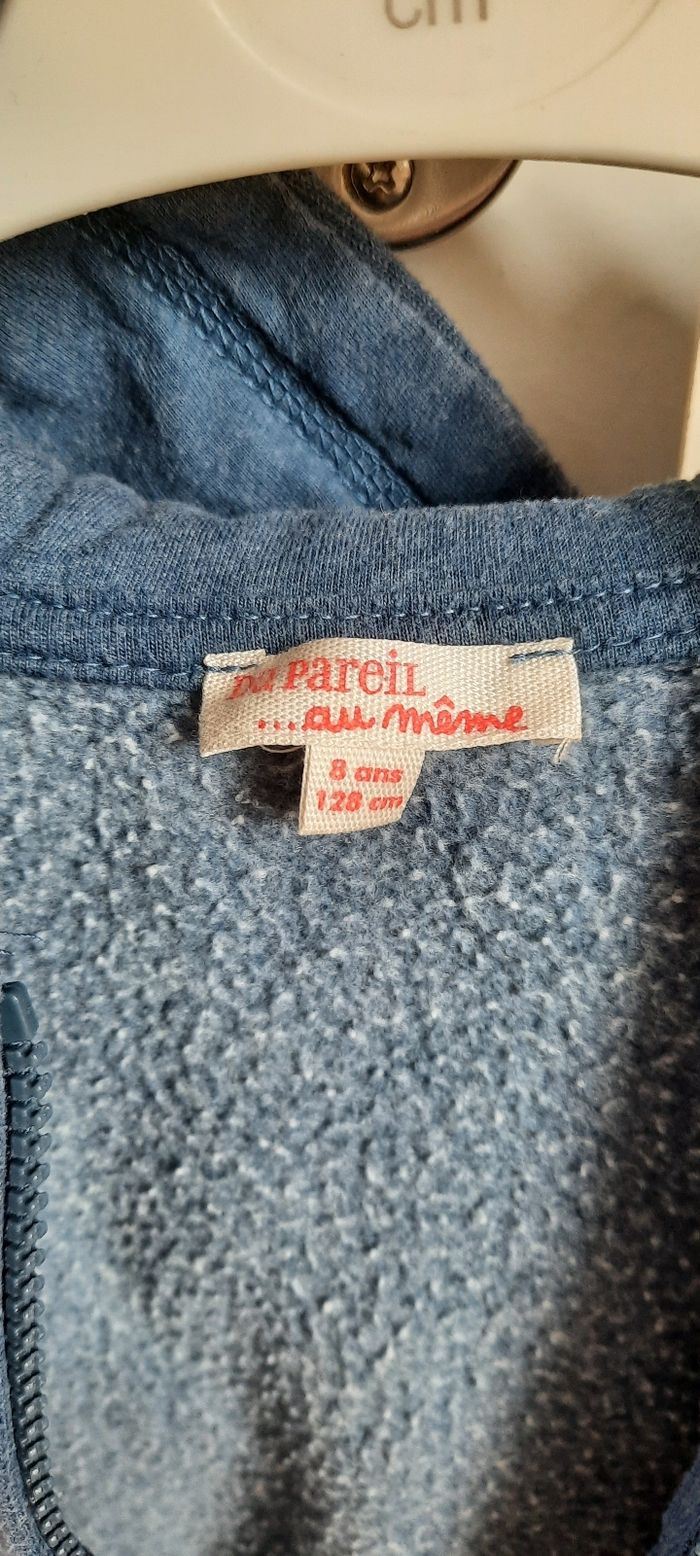 Gilet taille 8 ans marque du pareil au même, pas de tâche pas de trou mais bien porté donc usure normale,bouloche un peu(sûrement dû a la matière), coton et polyester, avec poches et capuche.