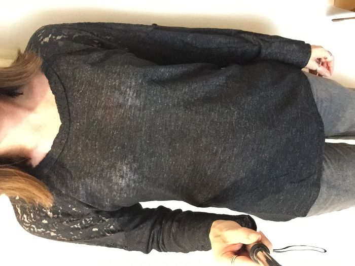 T shirt manches longues avec dentelle sur le haut des manches et en haut du dos, gris noir chiné, en très bon état, taille M.