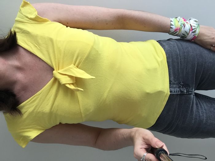 Tee shirt jaune avec un noeud à nouer au décolleté, col V, taille comme un S / 36. Mode vintage style Y2k années 2000