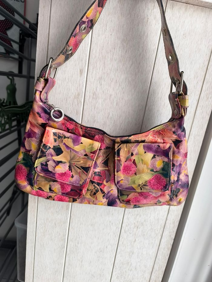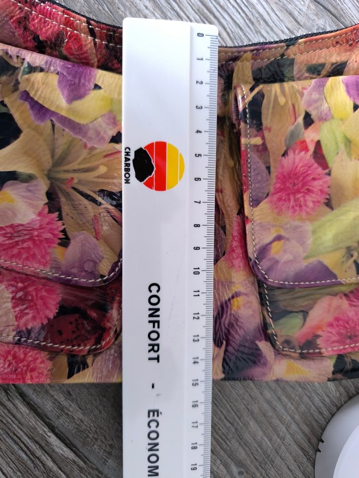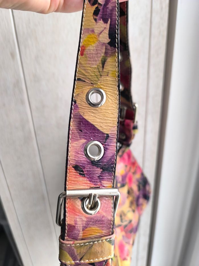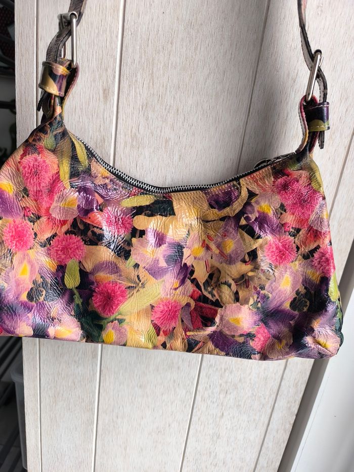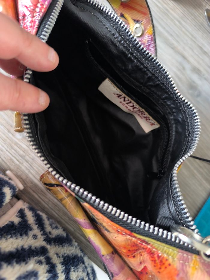 Marque: Andorra Shoenen Couleur: Fleuri multicolore effet huilée Dimensions: Voir photo Etat: Très bon état peu porté Petit sac à main porté épaule tout simple 1 seul compartiment principal avec 1 poche à fermeture éclair 2 poches avant à aimant fermeture éclair couleur argenté bandoulière (anse) réglable