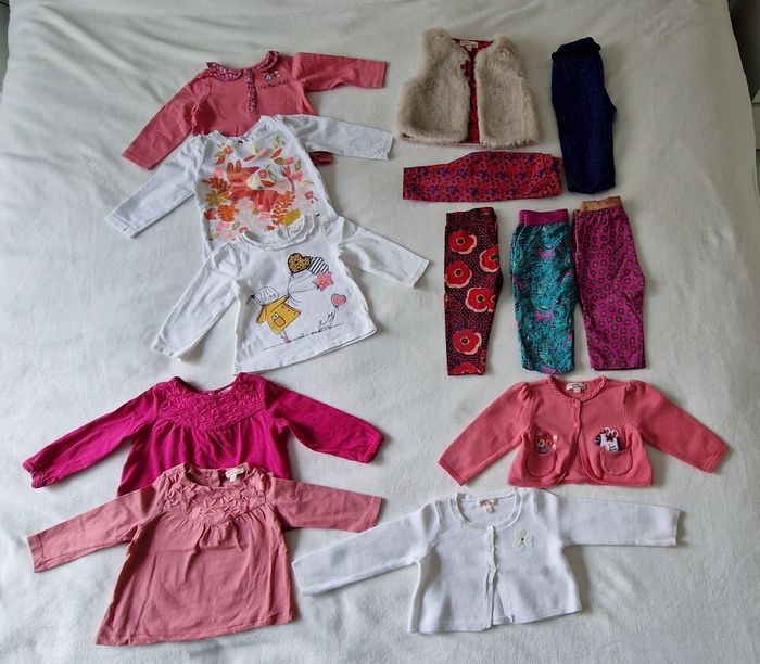 Lot de vêtements bébé fille DPAM Taille 9 mois - 5 pulls / t-shirts manches longues - 5 leggings - 1 gilet fausse fourrure sans manche - 2 gilets Tès bon état, sans tâche