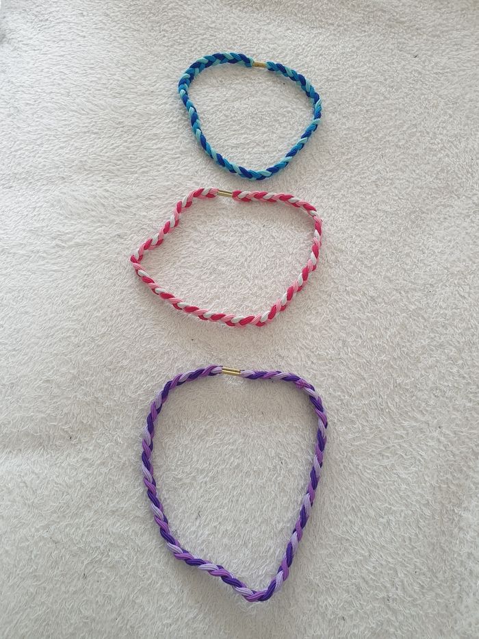 Lot de 3 bandeaux élastiques. Tressés. Pour la tête et les cheveux. Ils mesure environ 15cm de diamètre mais sont très élastiques. Neufs.
