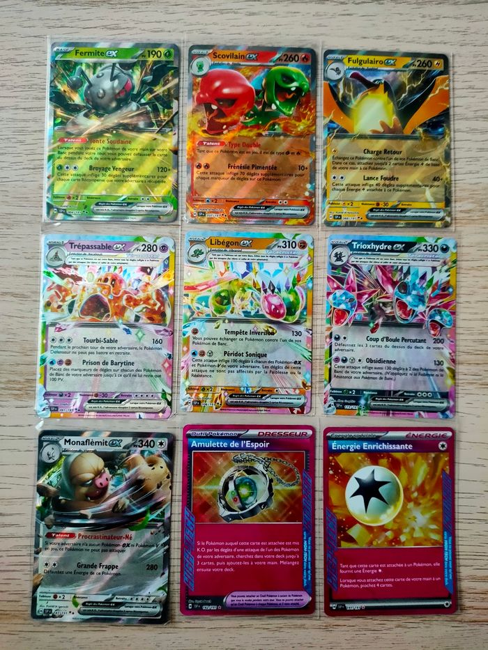 Bonjour, je vends différentes cartes Pokémon de l'extension Étincelles Déferlantes. Les cartes sont toutes officielles.  Prix du lot : 29€ Possible de prendre à l'unité:  3,5€/carte Cartes restantes : 004/191 Fermite EX 037/191 Scovilain EX 068/191 Fulgulairo EX 091/191 Trépassable EX 106/191 Libégon EX 119/191 Trioxhydre EX 147/191 Monaflèmit EX 162/191 Amulette de l'Espoir 191/191 Énergie Enrichissante Plus de photos possibles sur demande  Livraison possible via le relais de votre choix N'hésitez pas à regarder mes autres annonces ;)