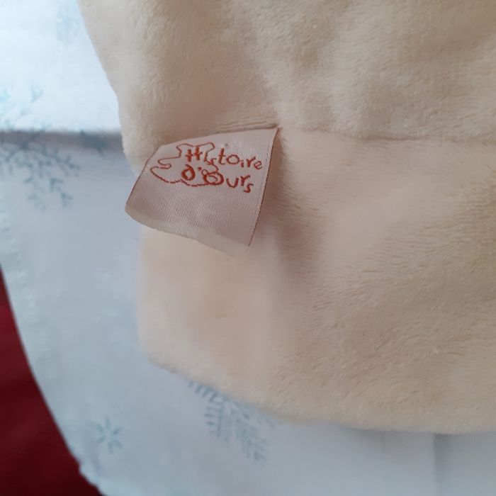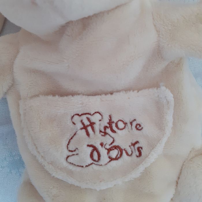Marionnette-doudou marque Histoire d'ours. Tête et pattes arrières rembourrées; yeux boutons; petite poche ventrale brodée. Hauteur totale de 22 cm ; lavable à 30° // voir photos pour détails