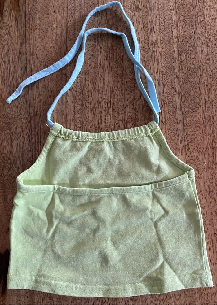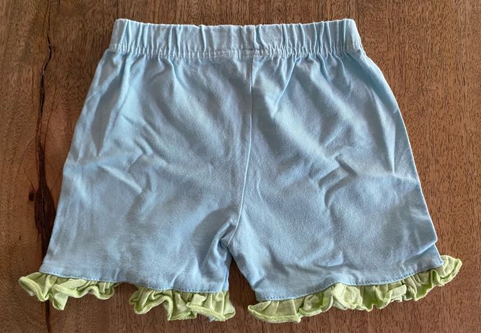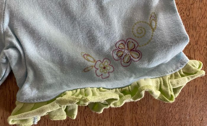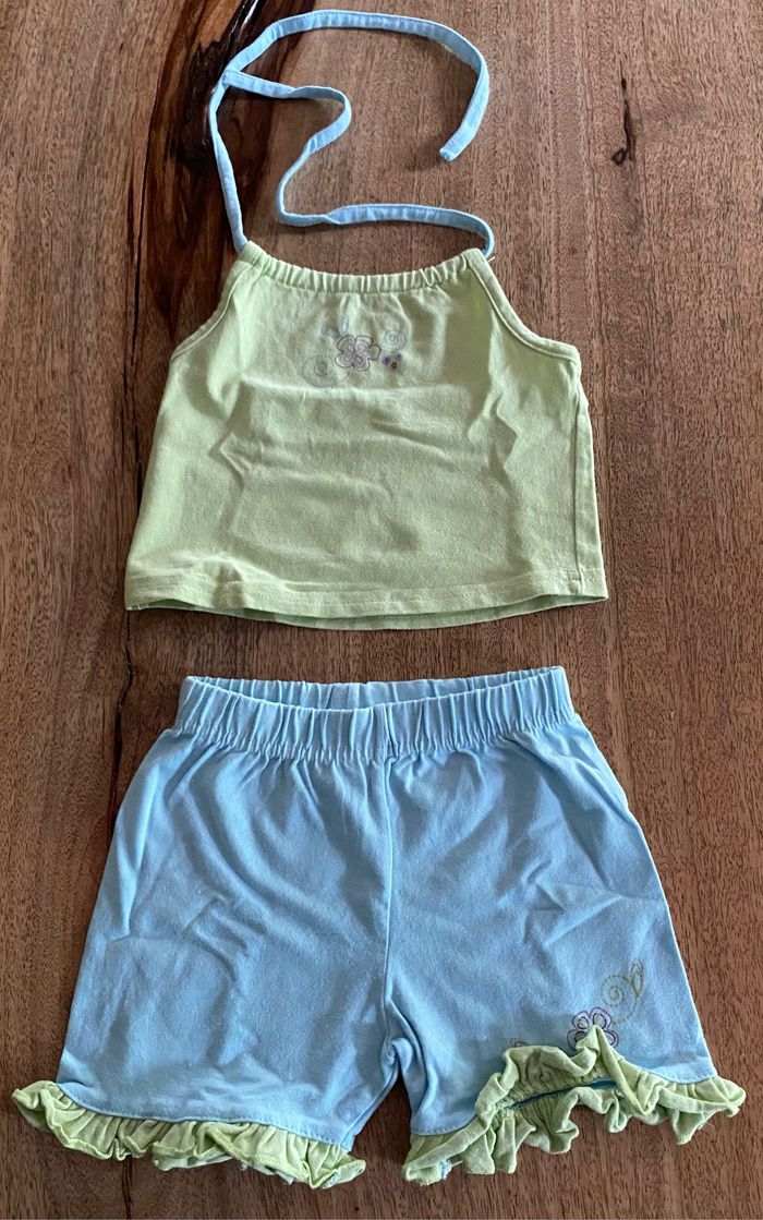 Ensemble sans tache T-shirt dos nue vert claire dessin de fleur multicolore Short bleu clair avec une dentelle vert en bas à gauche dessin de fleur multicolore. 95% coton et 5 % elasthanne