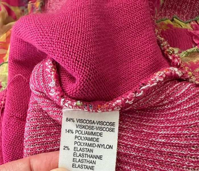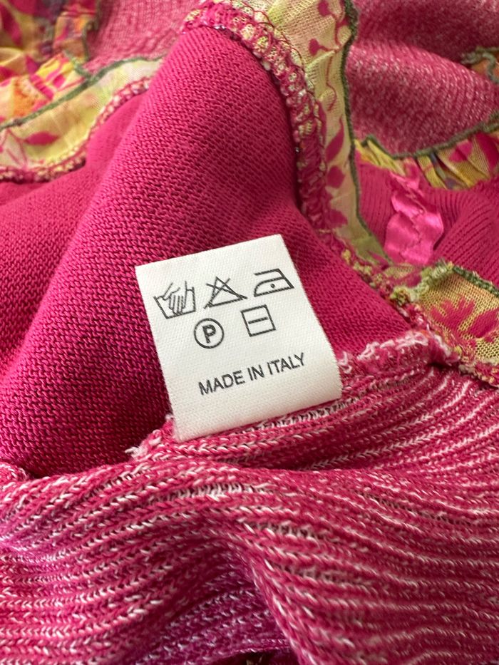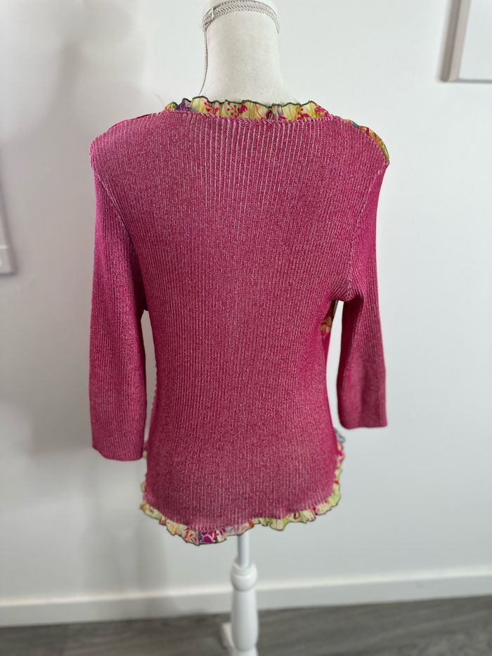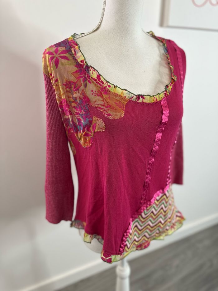 Blouse - Excellent état - Taille 38 équivalent M Dimensions en bas de l’annonce - Rose fuchsia, multicolore et pailleté - Détails en mesh, satin, broderies - Imprimés fleurs - Manches 3/4 - Style Y2K, années 2000’ - Fabrication italienne 🇮🇹 - Viscose, polyamide et élastane Dimensions: - 52 à 63cm niveau aisselles - 60cm de long