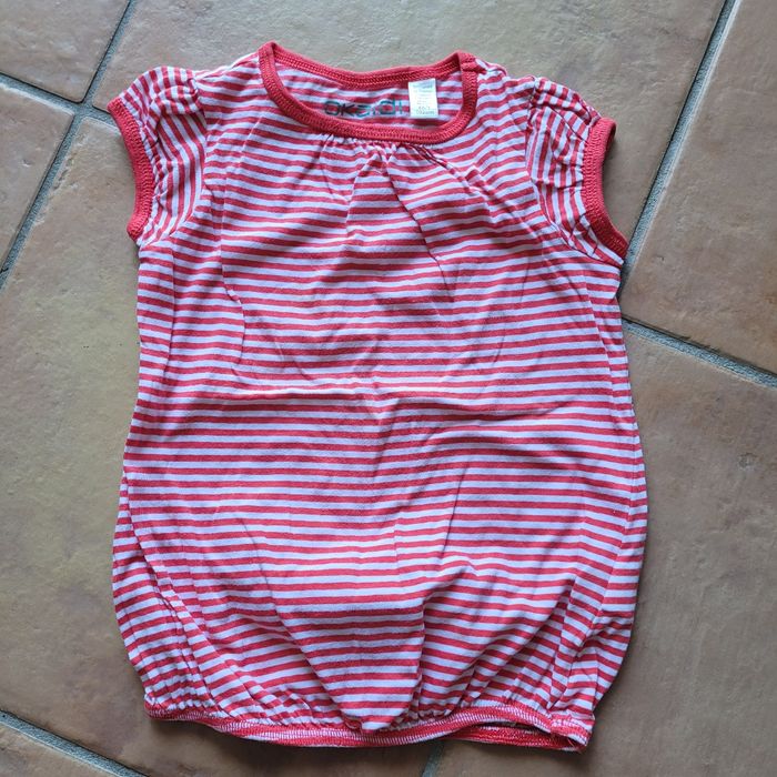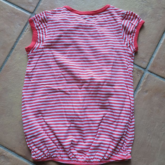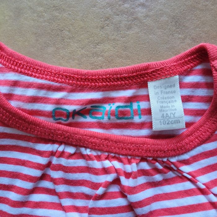Tee-shirt Okaidi 4 ans marinière rouge et blanc. Élastique sur le bas. Très bon état. Envoi dans la journée en mondial relay ou chronoshop2shop.