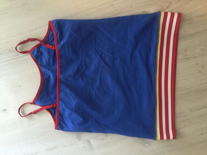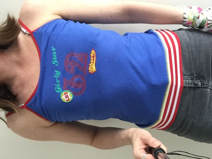 Débardeur fines bretelles, avec une brassière bandeau intégrée, taille comme un XS. Imprimé slogan girly.
