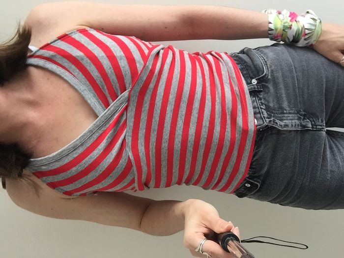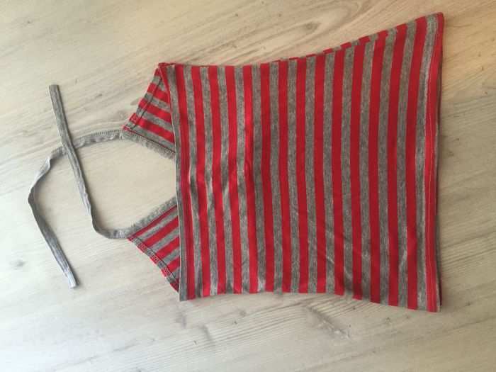 Débardeur rayures rouge gris dos nu à nouer avec une ficelle derrière le cou, taille S, décolleté V.