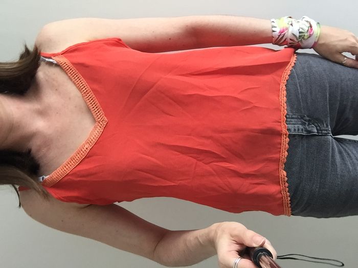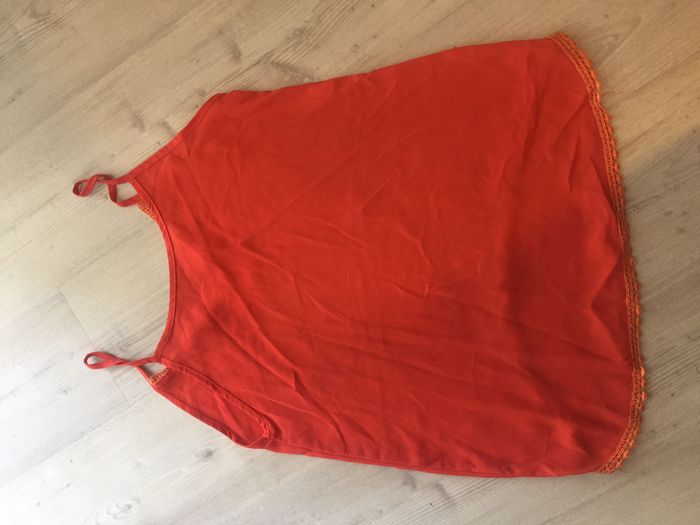 Débardeur caraco, matière voile avec dentelle, fines bretelles, col V, plus long derrière que devant, taille S / 36. Etiquettes enlevées.