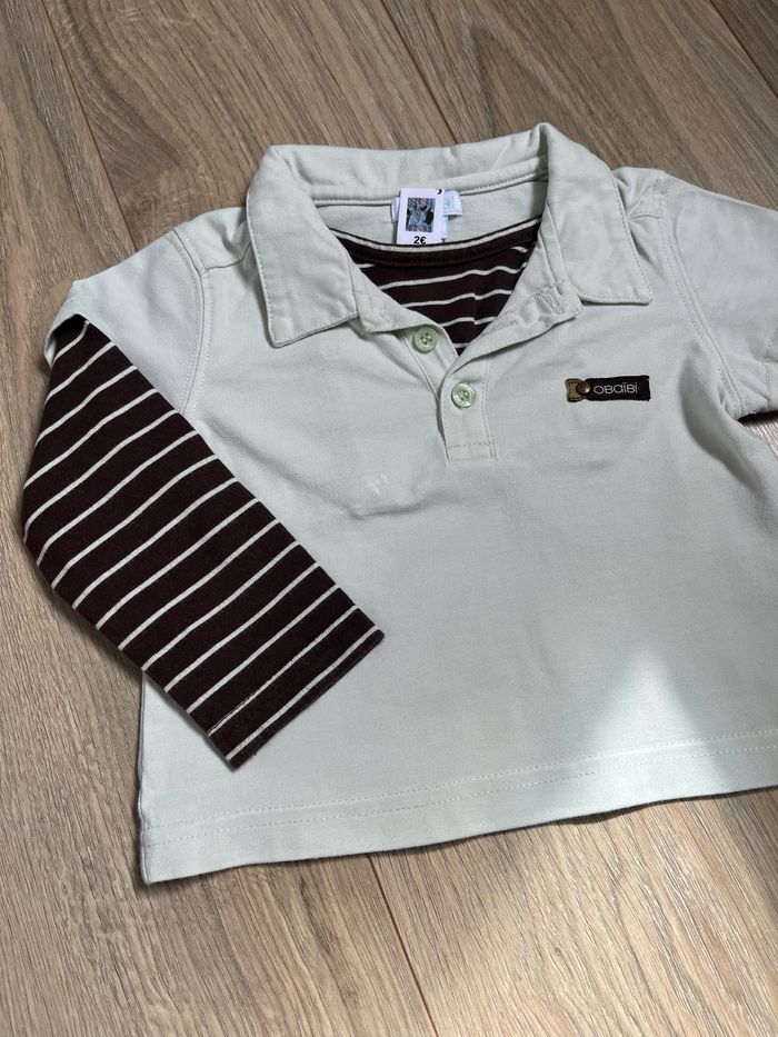 Polo garçon Taille 12mois Okaidi obaidi Coton Vert amande, manches marron rayé Très bon état #liliesouris #dinan #saintmalo #combourg #okaidi #obaibi #garcon12mois #obaibi12mois #okaidi12mois #ete #printemps #2025