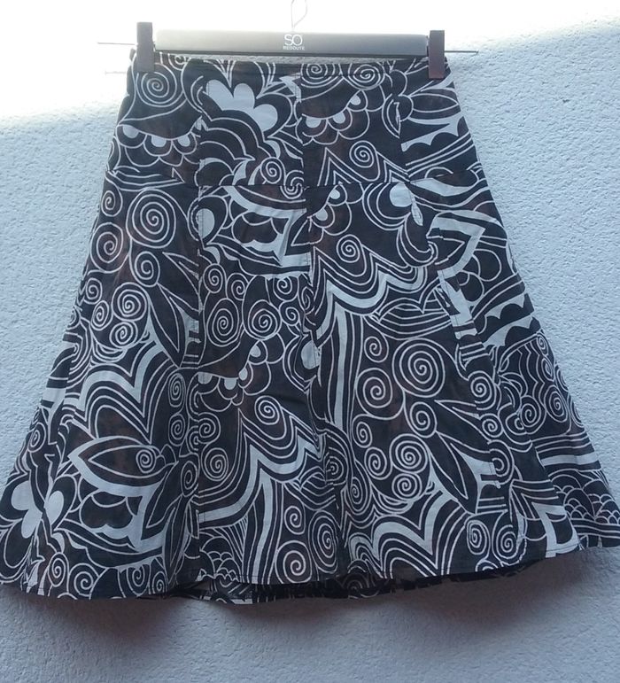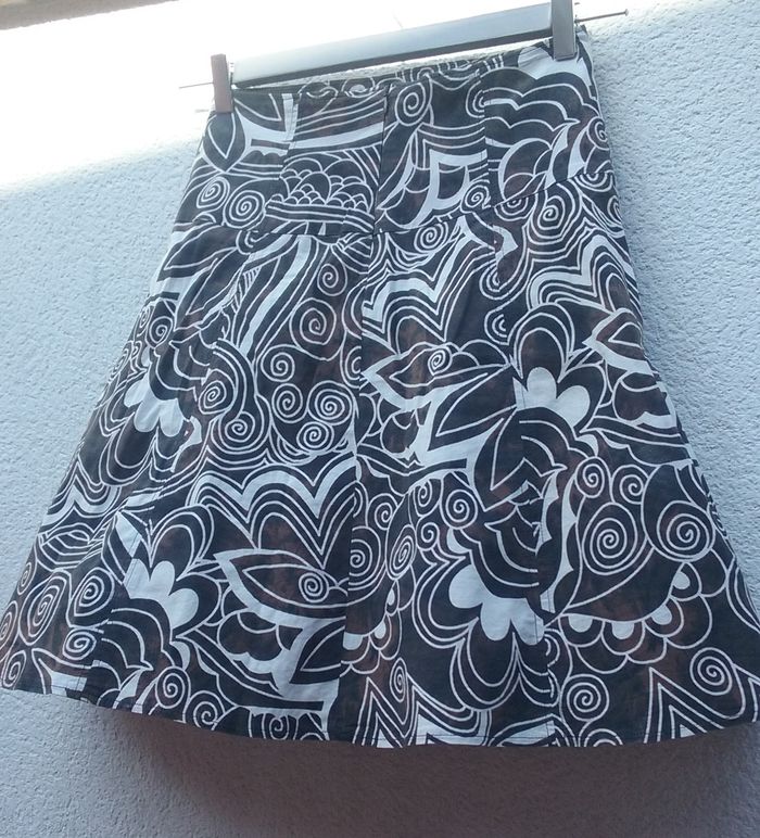 Fermeture zippée au dos, coloris dégradés de marron et blanc cassé. Il n'y a plus l'étiquette concernant la composition du tissu mais je peux dire tout de même qu'il y a de l'élasthanne puisque la jupe est légèrement élastique!