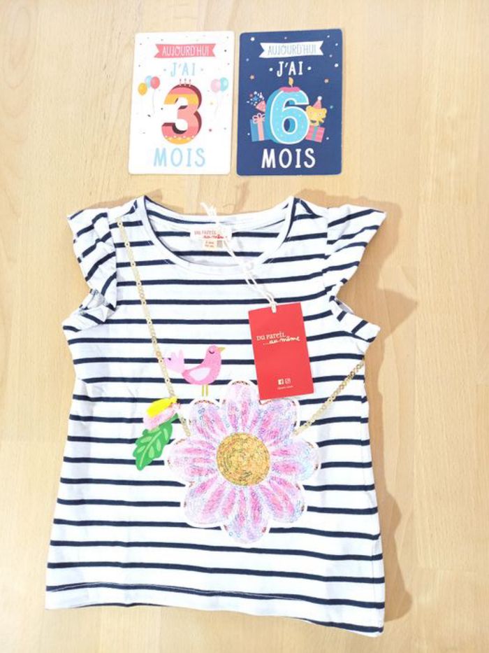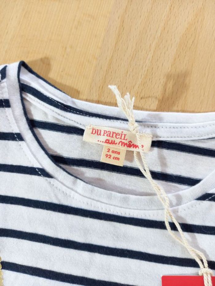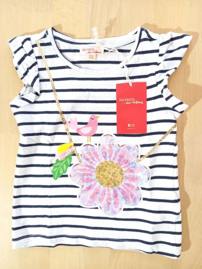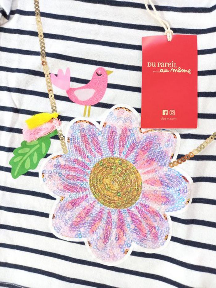 T-shirt de la marque Du Pareil au Même, taille 2 ans, 92 cm (désormais appelé 36 mois, 92 cm, chez DPAM) 🐦 Il est neuf et étiqueté 🏷, je n'ai pas eu le temps de le mettre à ma fille. T-shirt manches courtes coloris banc à rayures marine, motif sac à main en forme de fleur en sequins roses irisés / doré avec oiseau J'ai beaucoup d'articles en parfait état, allez y faire un tour! Suivez le lien ;) #lesgooniesNouveautés #lesgoonies36mois #lesgoonies36Printempsété #lesgoonies2ansPrintempsété #lesgoonies2ansmois Les publications en 24 mois (86 cm) et 36 mois (92 cm) printemps / été commencent. N'hésitez pas à vous abonner à mon profil pour suivre mes nouveautés. Articles 100% fille dans mon dressing, de la taille 24 mois à 36 mois, des articles de puériculture, et des jouets de la naissance à 6-7 ans. Possibilité de faire des lots. Remises et frais de port groupés. Livraison rapide et très soignée.