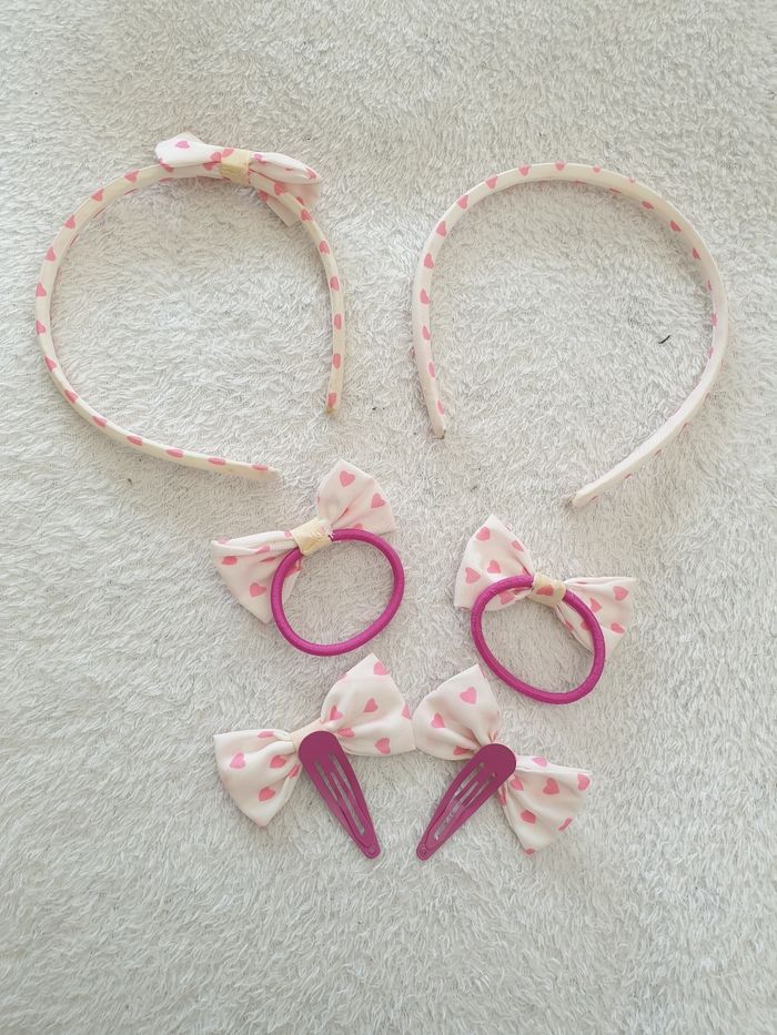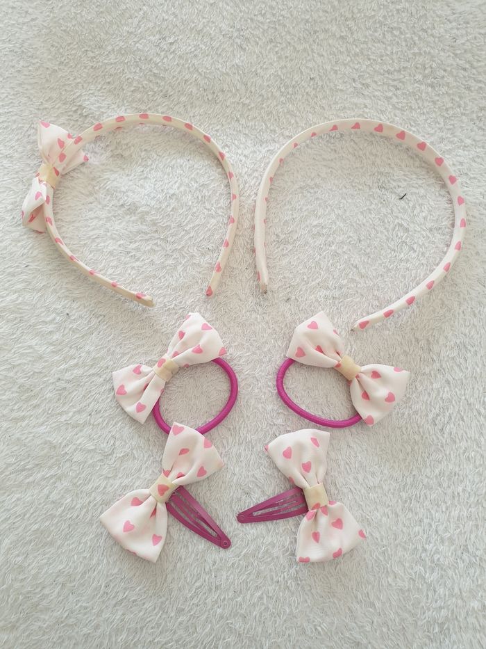 Ensemble d'accessoires cheveux. A coeur rose. 2 serre-têtes, 2 pinces et 2 élastiques. A déjà été utilisé et a quelques traces d'utilisation.