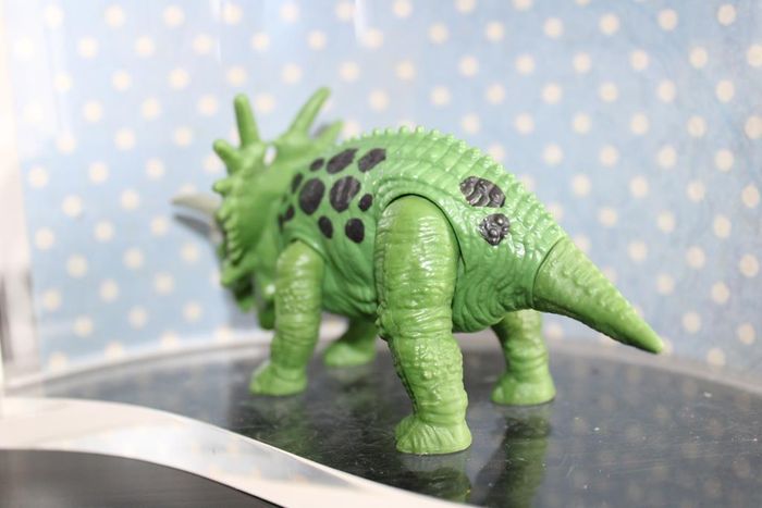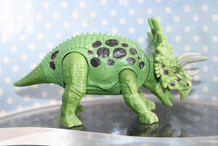 Figurine de triceratop avec pates et tête articulées fabriquée par Chap mei Longueur 7 cm Couleur vert En très bon état Réponds avec plaisir aux demandes d'informations complémentairre Réponse rapide Envoi soigné dans les meilleurs délais