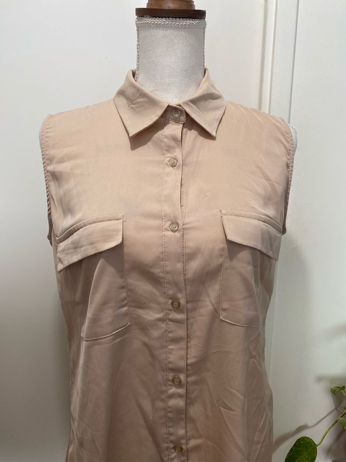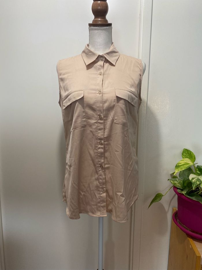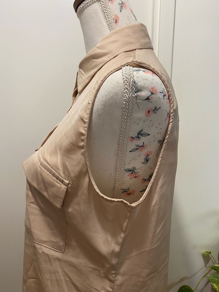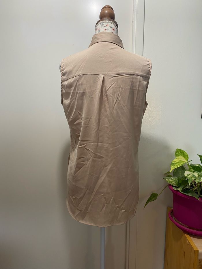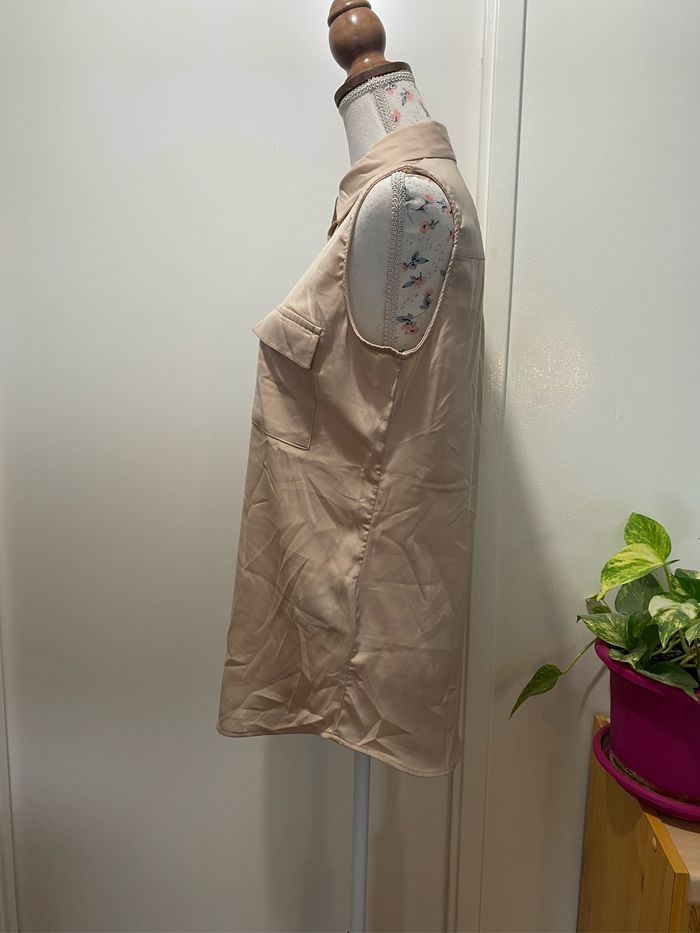 Blouse fluide sans manches femme Taille 44 La Halle Couleur beige Matière: 97% polyester, 3% elasthanne, Dimensions: largeur des épaules 38cm, Largeur des aisselles 51,5cm Longueur 73cm, 2 poches devant En très bonne état Envoie Rapide 👍