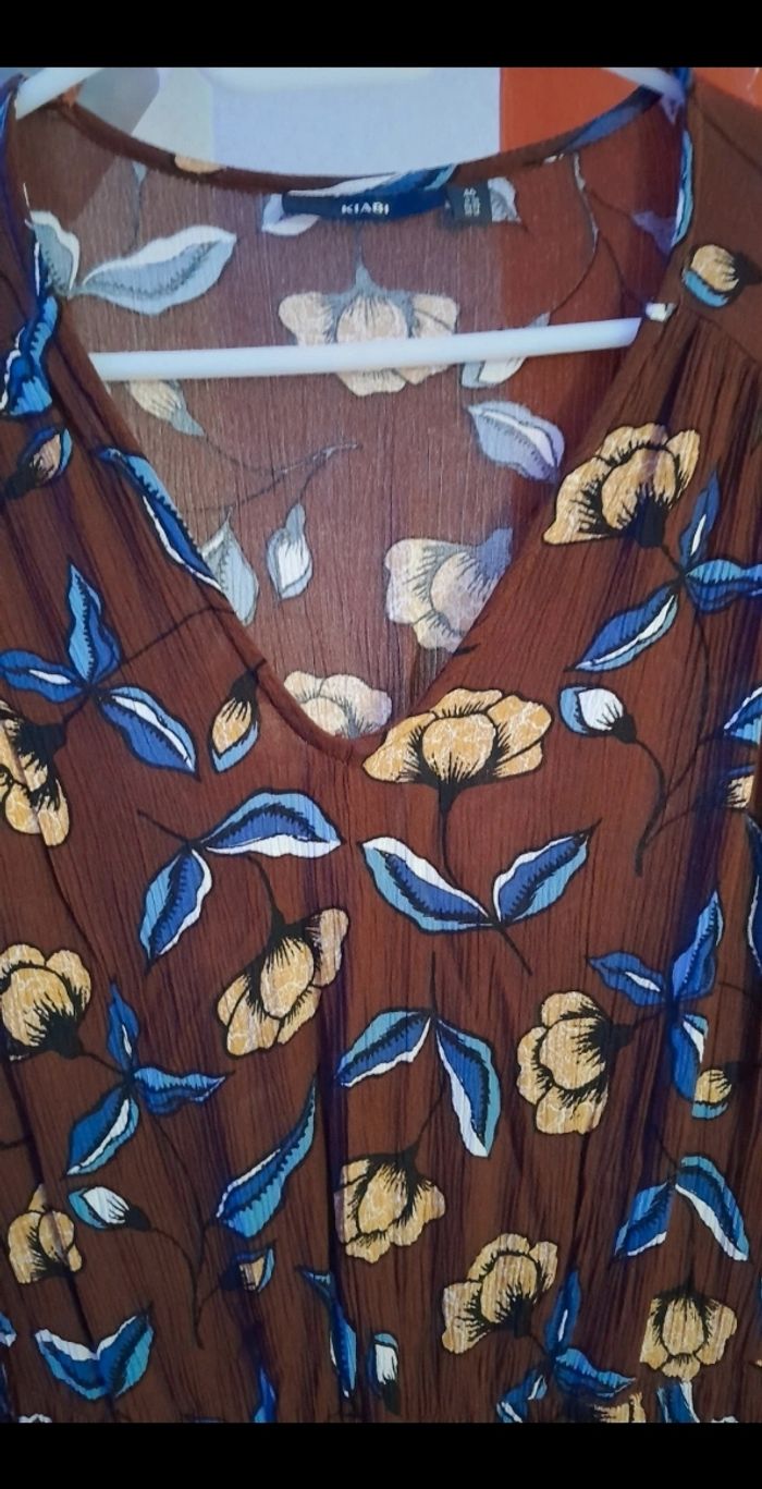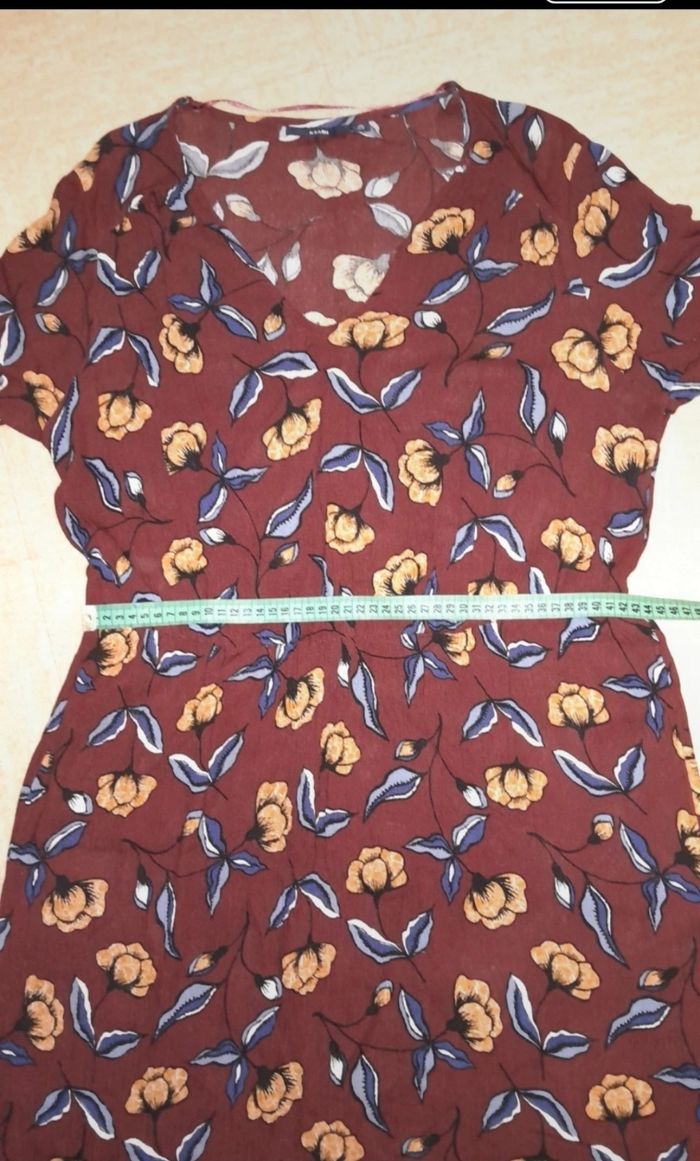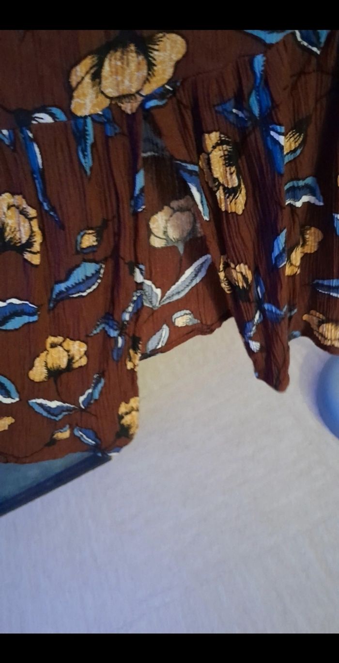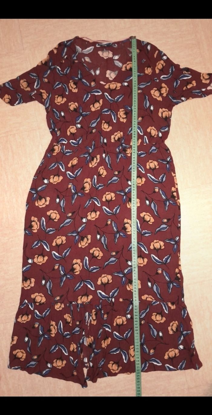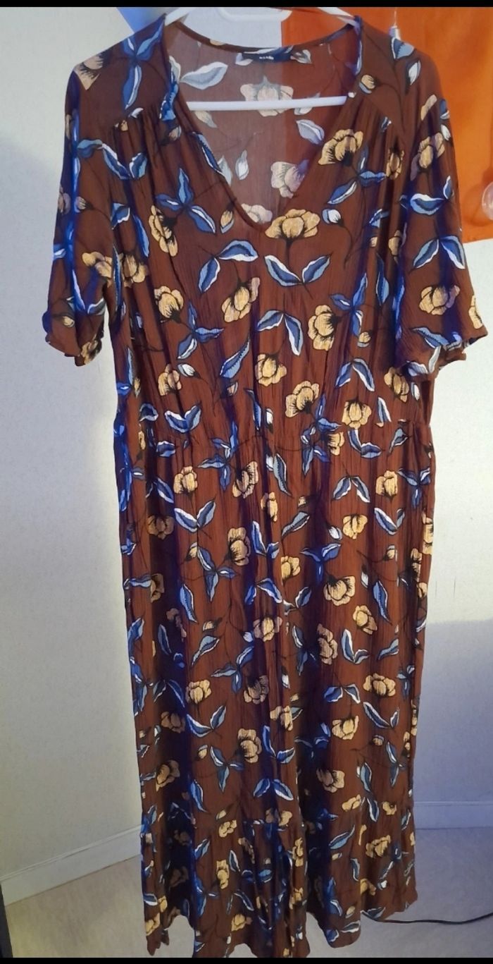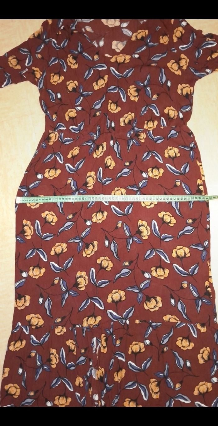 Robe longue légère et fluide/ portée 1 fois Motif fleuri marron Taille elastiquée Au niveau du bas effet volanté sur environ 25cm avec une fente au milieu sur le devant Matière: viscose