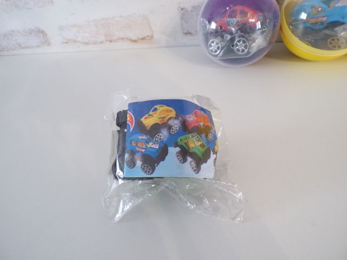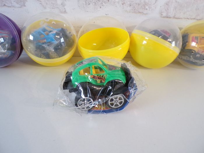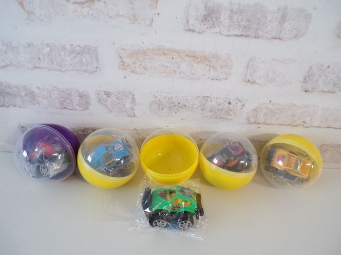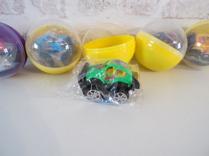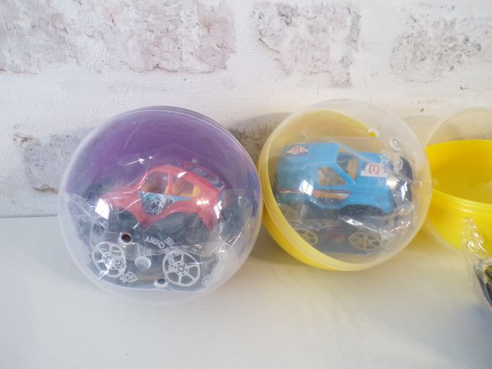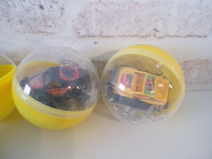 Lot de 5 boules surprises toutes neuves jamais ouvertes de 9 cm de diamètre environ. Les petits Monster Trucks sont à friction, et mesure environ 8 cm. Toutes les balles ont des Monster Trucks différents.