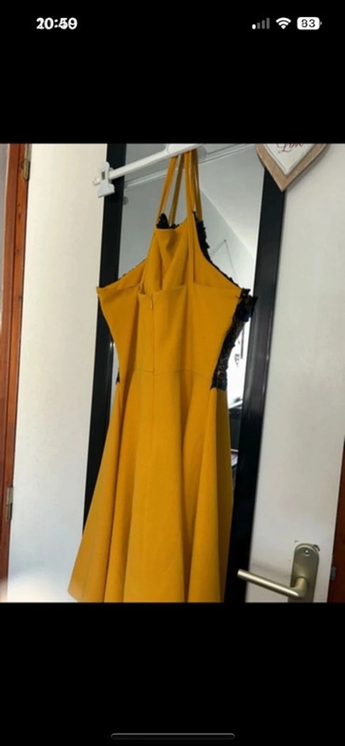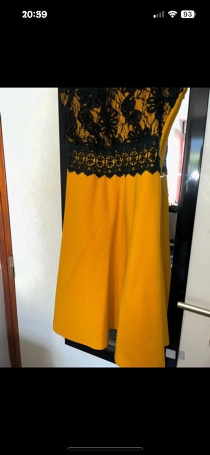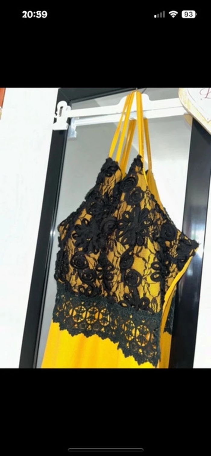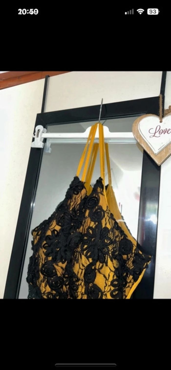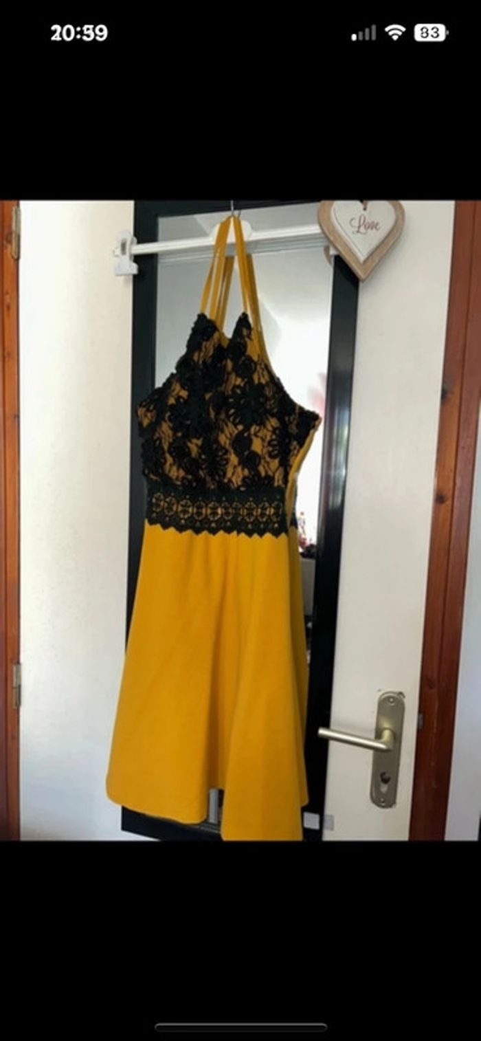 Robe sans bretelles avec liens autour du cou de couleur jaune moutarde et noire avec de la dentelle sur le décolleté taille L 40 en excellent état #virginiebzh56_taille_40