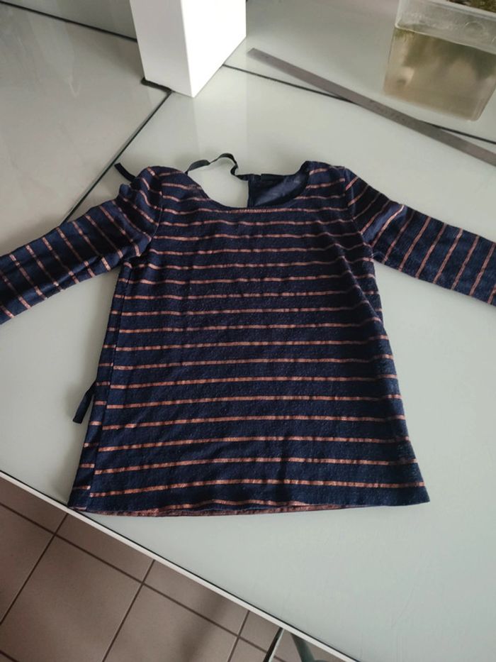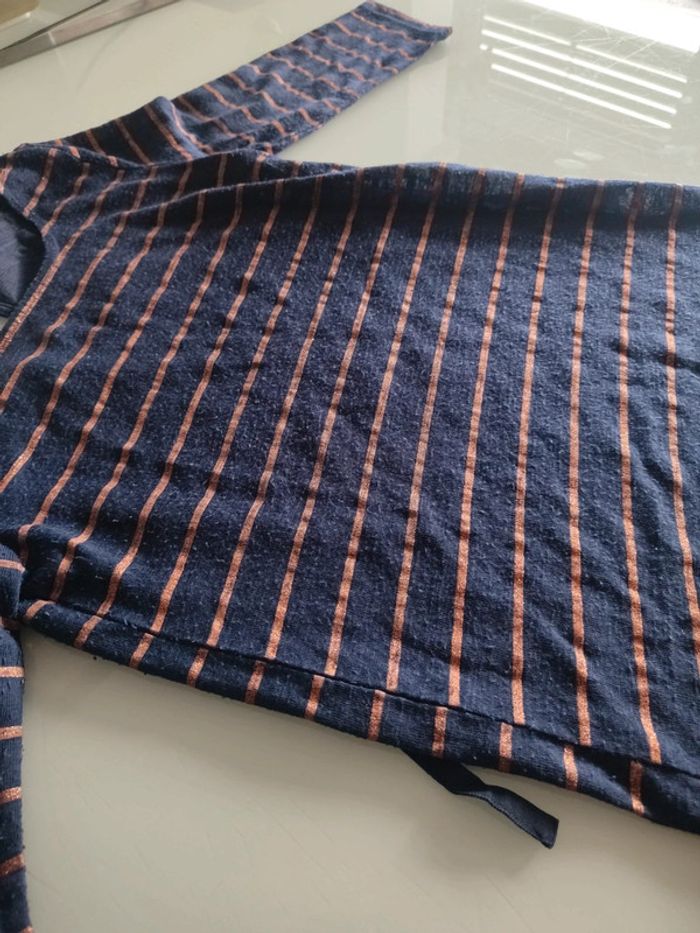Manches 3/4. Des petites bouloches mais qui s'enlèvent facilement je pense. Les bandes couleur bronze sont légèrement pailletées