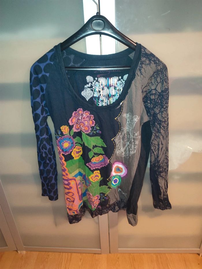 A été porté. Il est en très bon état général. N'a pas de trous C'est une taille 42 mais il taille petit, alors plutôt un 40 Si plusieurs articles vous intéressent, veuillez me contacter pour créer un lot 😊 #leiningerverotaille40 #taille40 #tshirtmancheslongues #desigual #desigualfemme