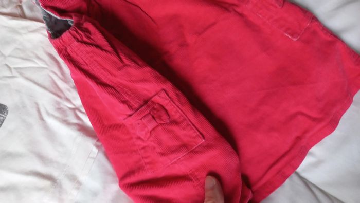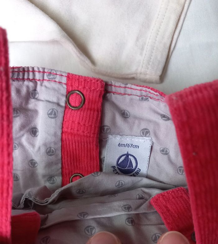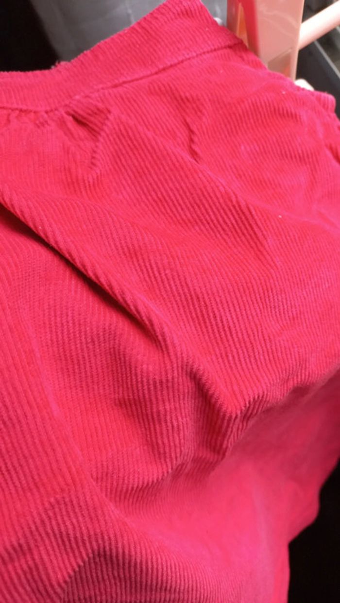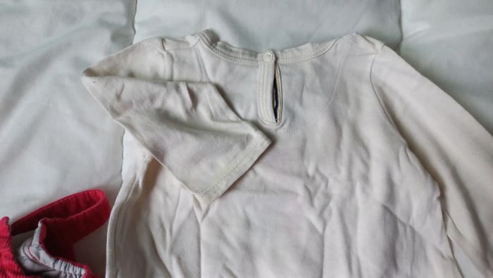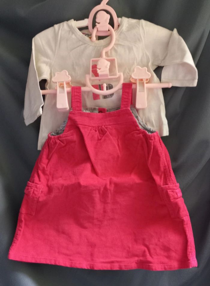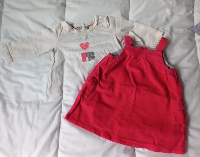 Robe rose framboise, aspect côtelé velour Boutons pression dans le dos et sur bretelles T-shirt manches longues beige crème Bouton Pressions sans le haut du dos Un peu jauni vers le col #scarabebe #scara6mois #scara9mois