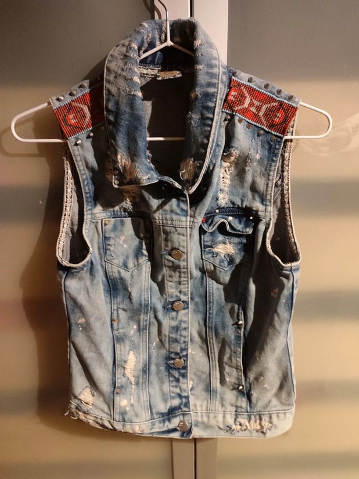 En très bon état. Il ne manque aucune perle et aucun pique #leiningerverotaille36 #giletvintage #giletfemme #giletfemme36 #sansmanches #bershka #bershkafemme #taille36 #jean #giletjean